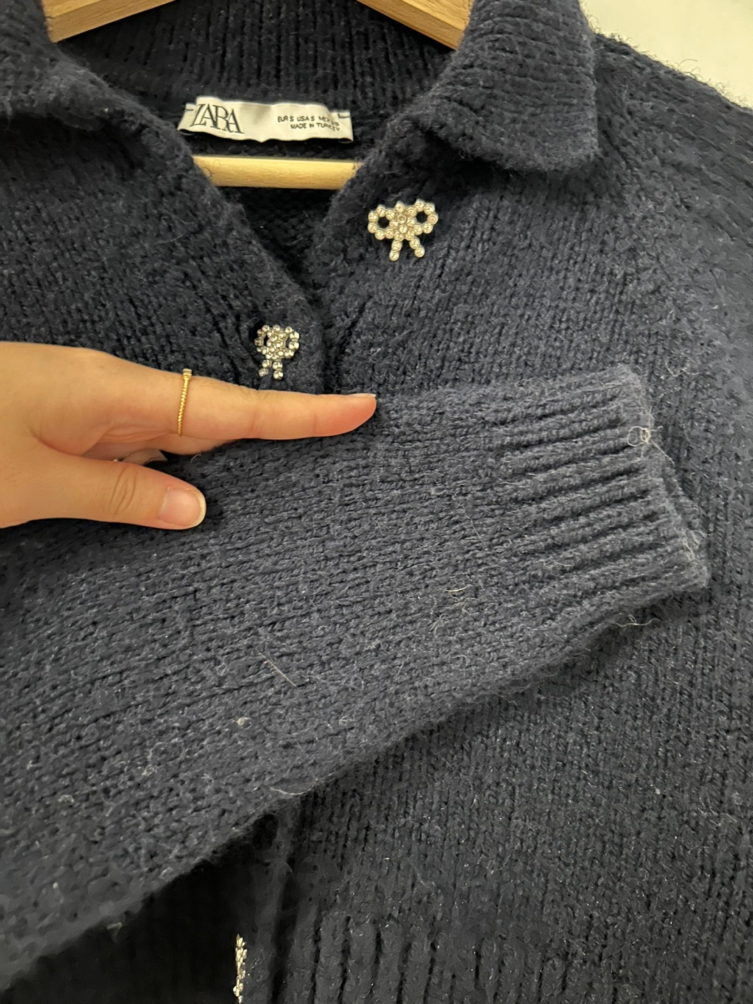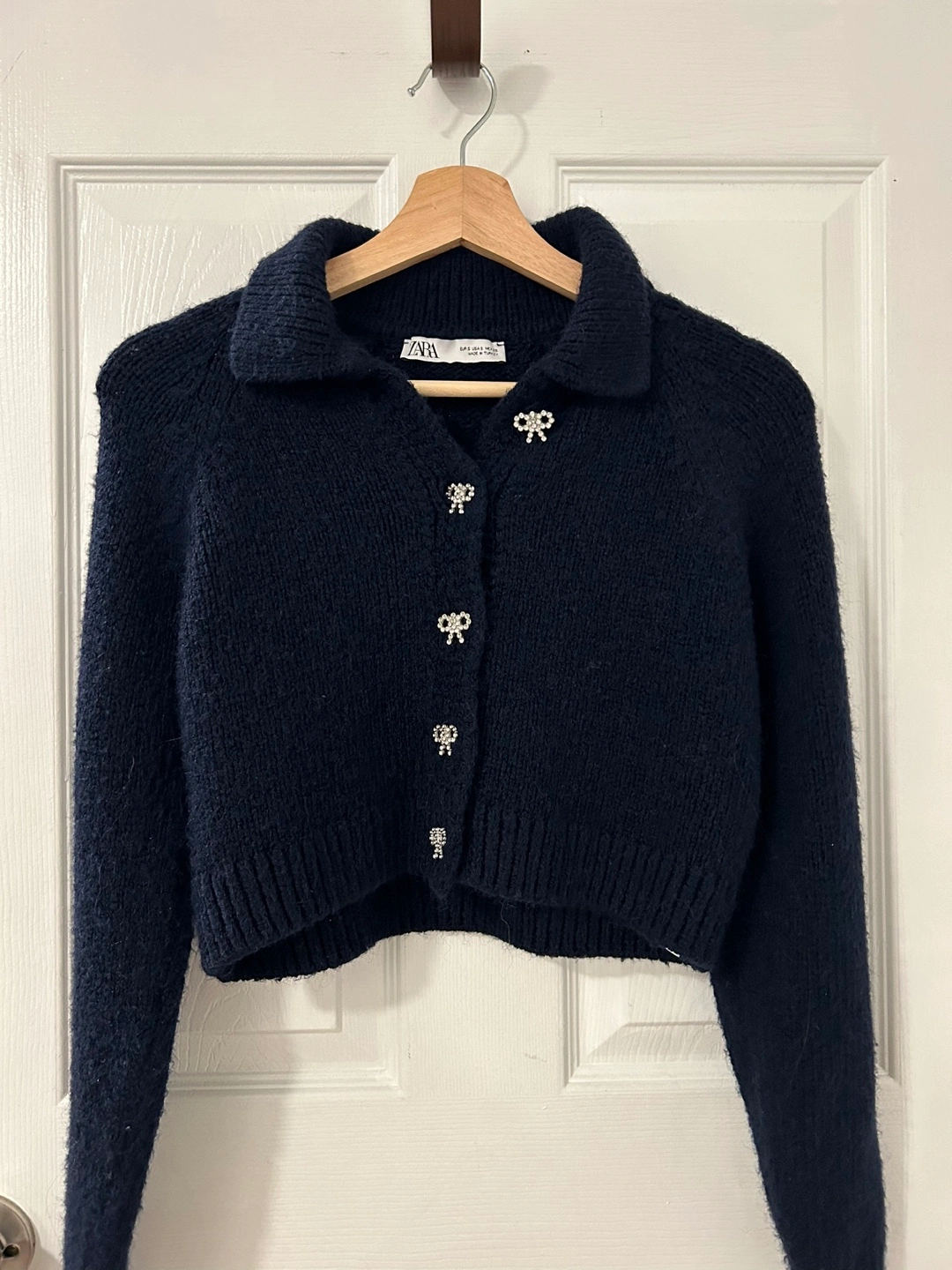 Buy & SellZara Blue Cropped Cardigan with Rhinestone Bow ButtonsZara Blue Cropped Cardigan with Rhinestone Bow Buttons$25Navy blue cropped cardigan with long sleeves and rhinestone bow buttons. Crop style, fit size 4 and underConditionLike newBrandZaraWHERE TO MEETCheck LocationView MapSELLERverifiedTamtamBloor West Village922 reviews3 chats·1 favorites·62 viewsSEND CHAT TO SELLERHi Tamtam! I’m interested in your listing.Hi Tamtam! I’m interested in your listing.Get the Karrot app to chatSign In to chat