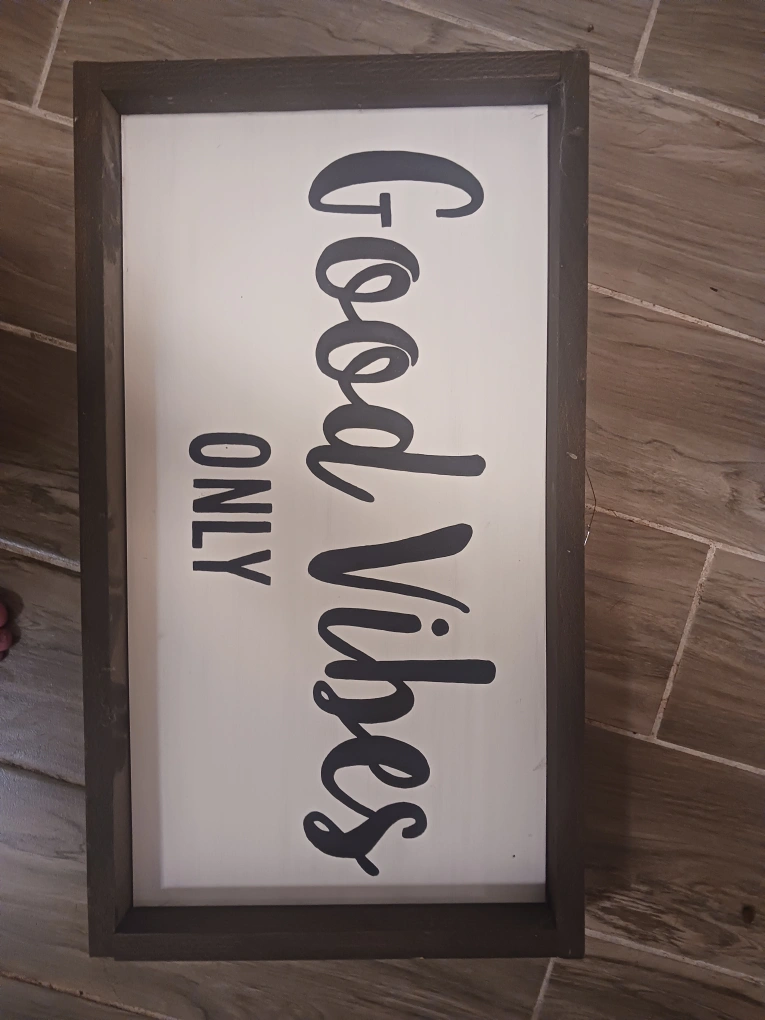 10Wooden sign with black lettering on a white background. The sign is framed with a brown wooden frame. hand painted