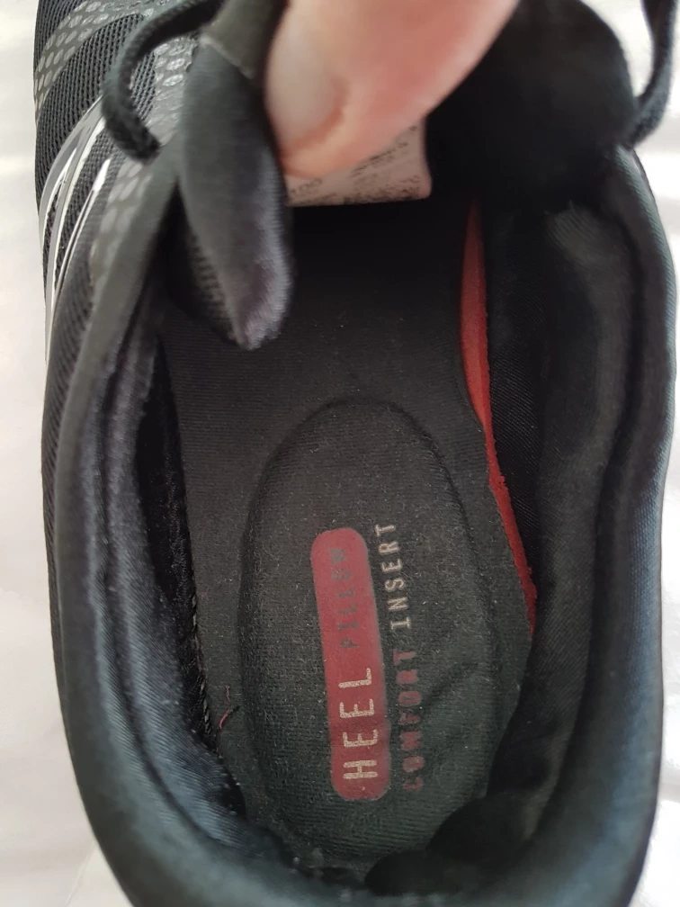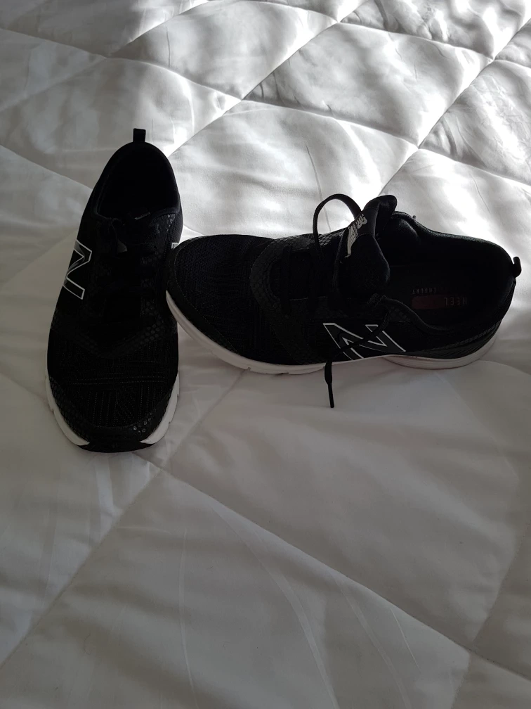 Black running shoes with white accents. Size 9.5 US. Black running shoes with white laces and New Balance logo. Size 9.5 US. Heel Pillow Cushion. No pet/ smoke home. Pick Up Cochrane, Alberta.