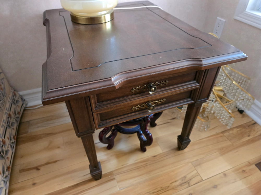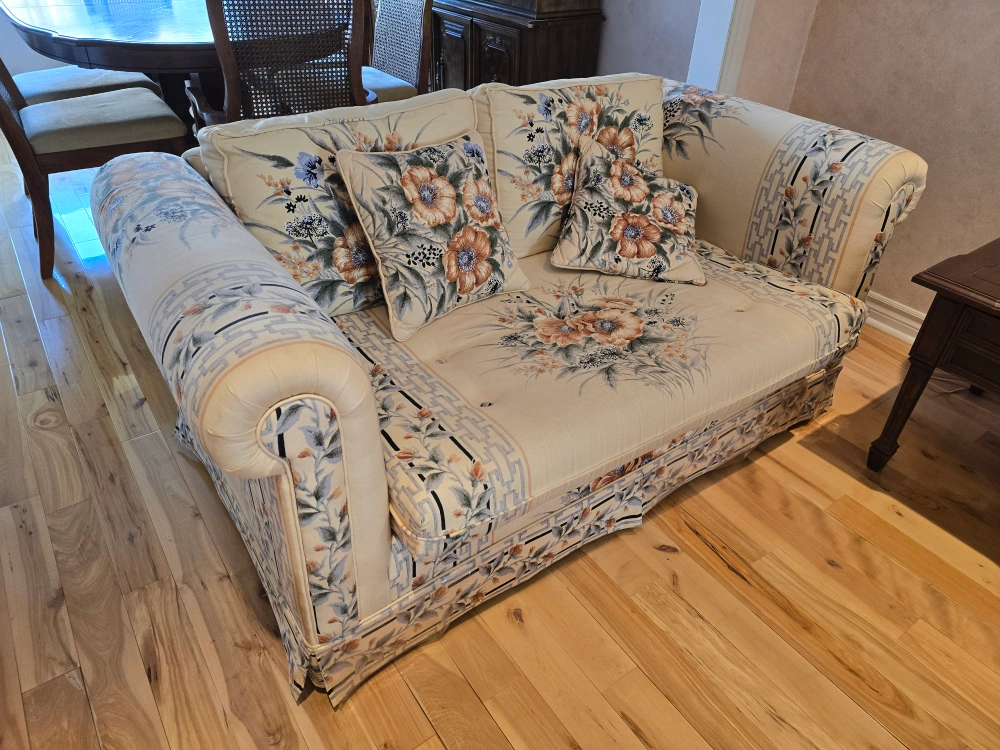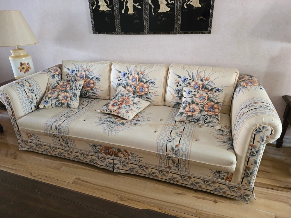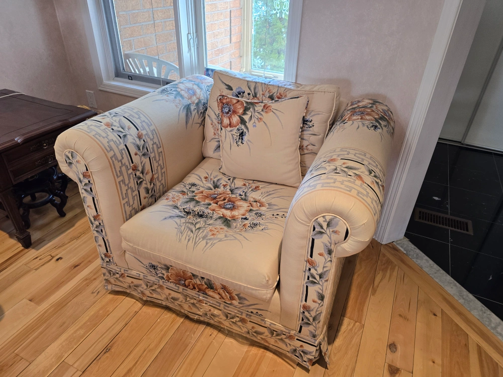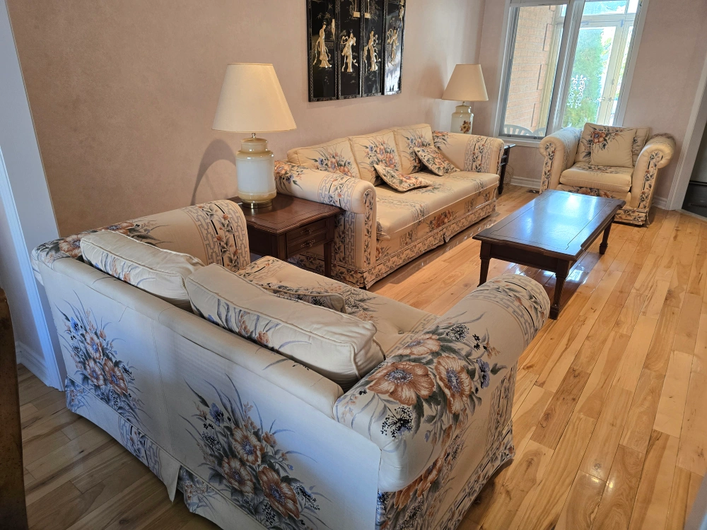 Complete set includes two-seater loveseat and three-seater sofa and chair. All have floral patterned fabric. Includes matching pillows. Also side lamp table and lamp sets. Matching coffee table. All for $350. Pick up in Mississauga. Mavis and Eglinton area.