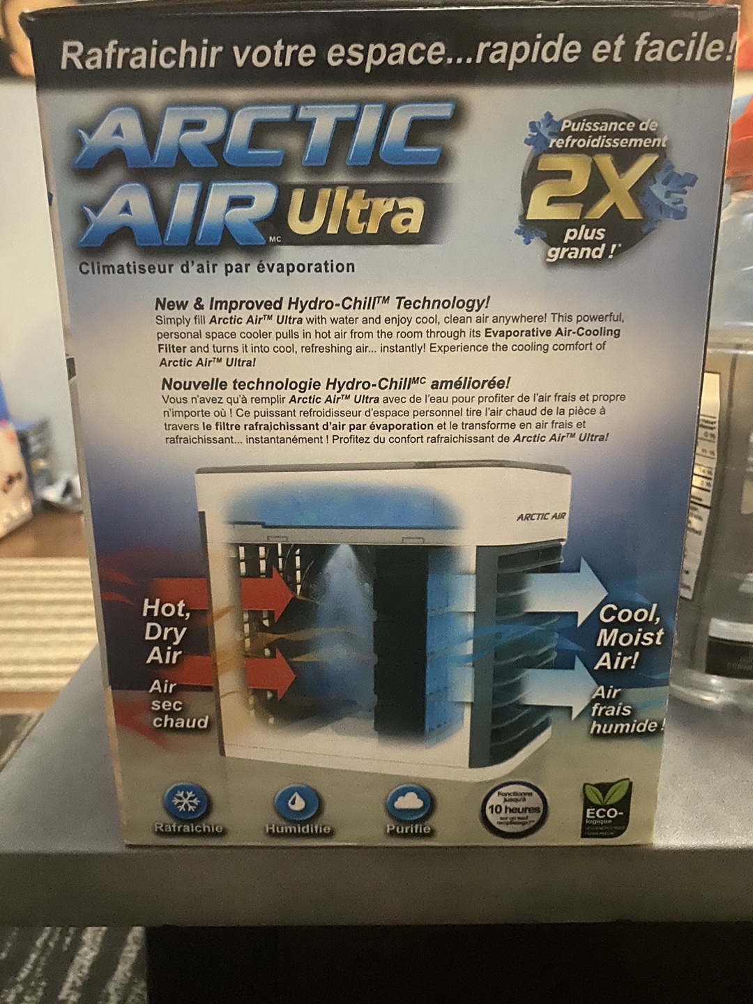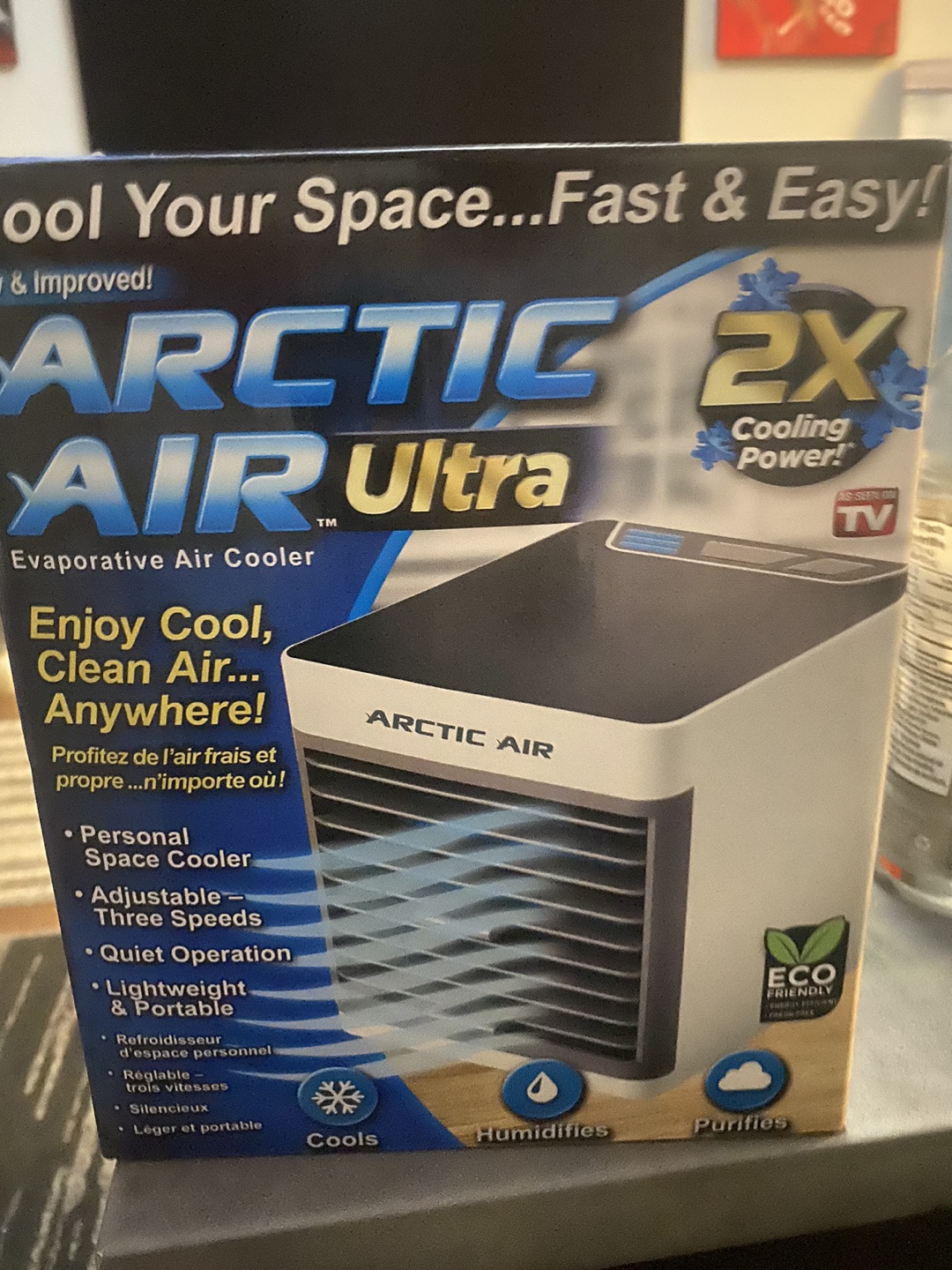 New & Improved Hydro-Chill technology. Evaporative air cooler with water and cool, clean air anywhere! Personal space cooler. Adjustable three speeds. Quiet operation. Lightweight and portable.