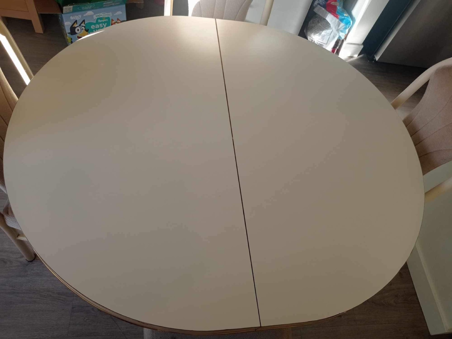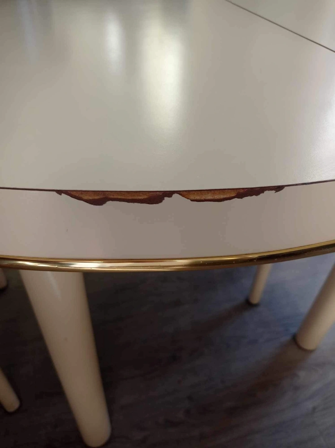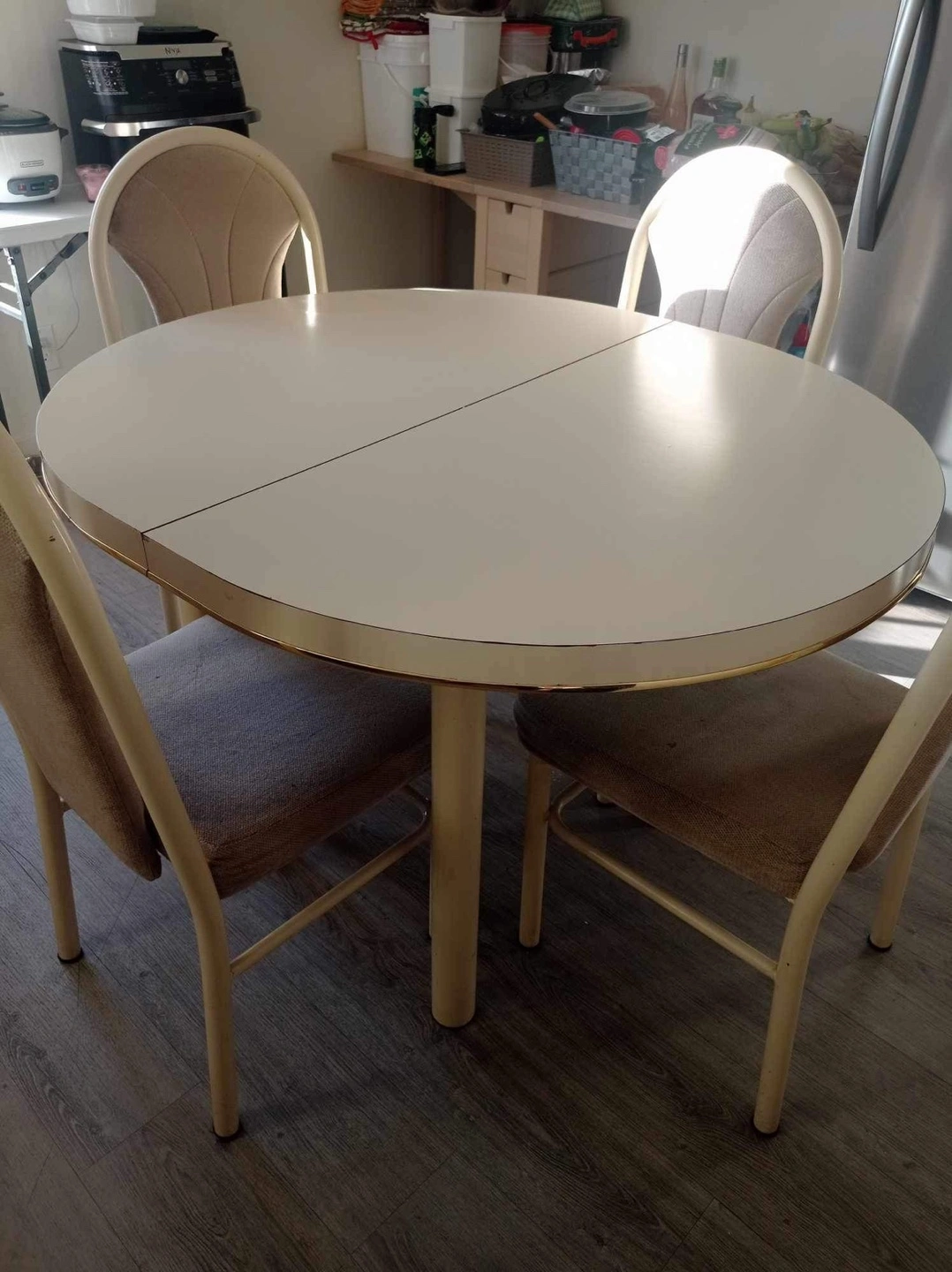 Dining table set with four chairs. Table is oval and has a removable leaf. The table has a gold trim around the edge and the chairs have tan fabric seats.