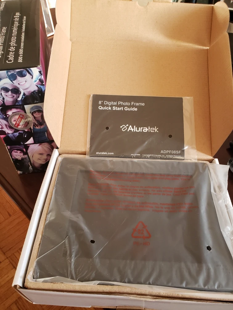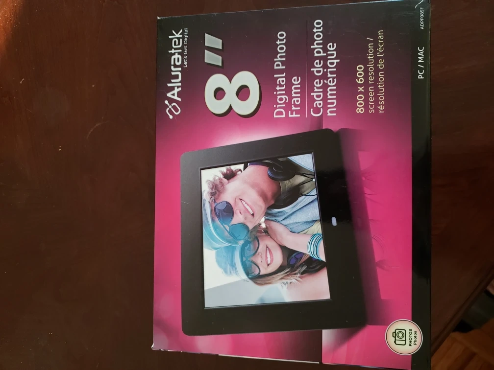 8" digital photo frame. Includes power adapter, and instruction manual. In original packaging.