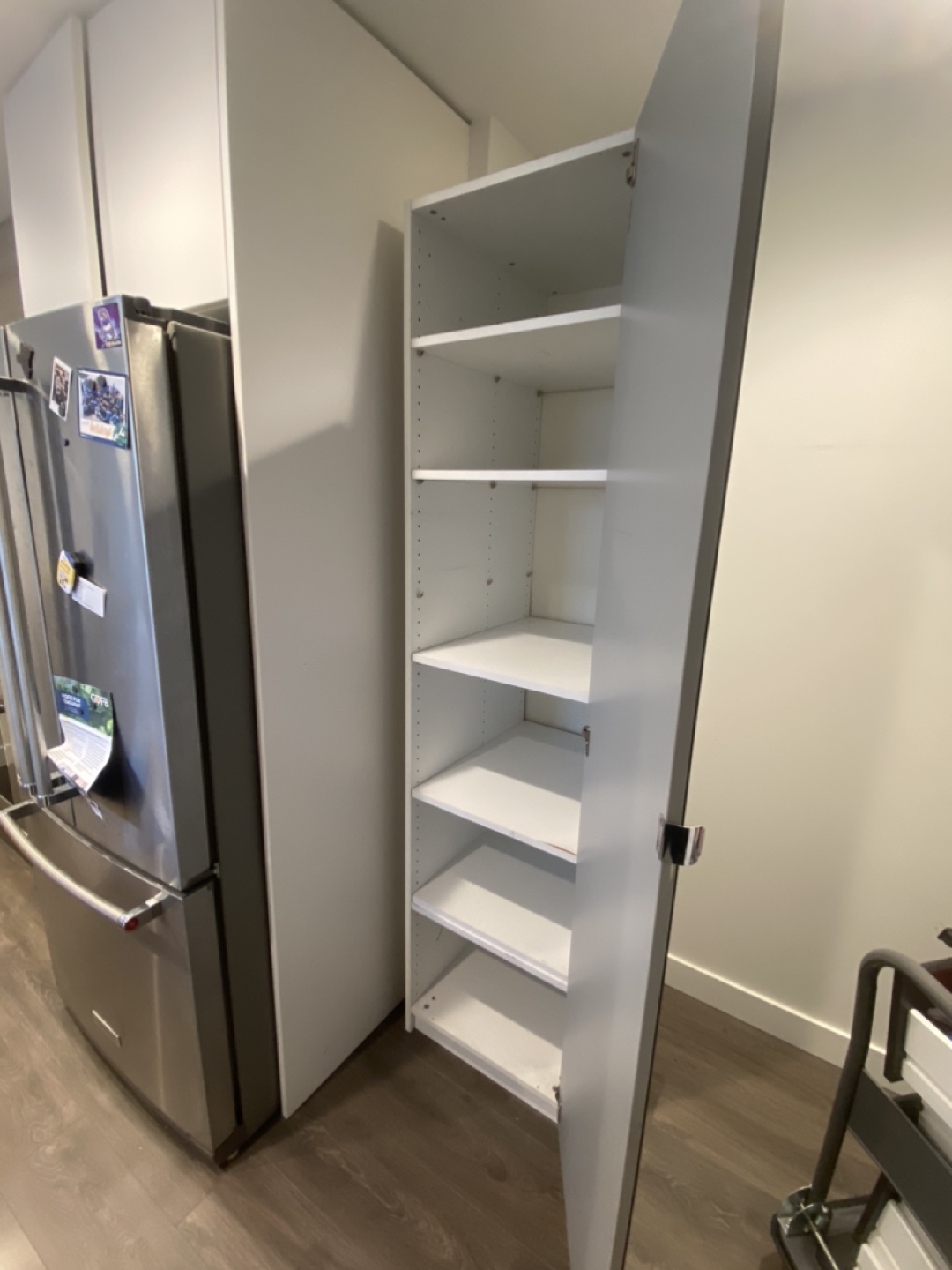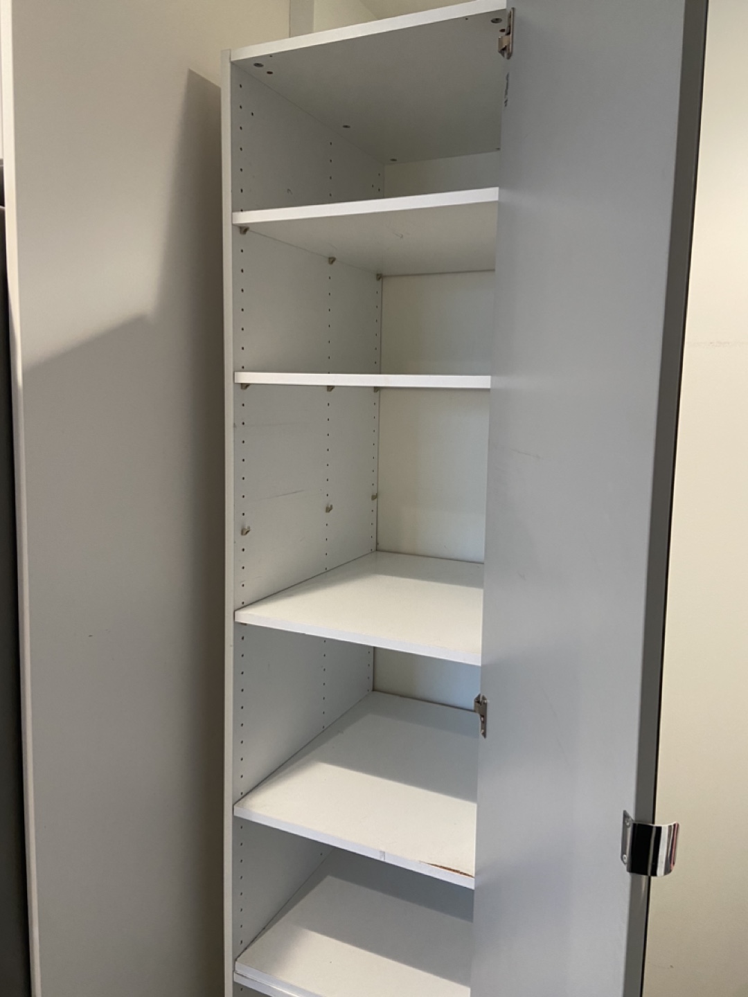 White cabinet with mirrored door. Has 5 shelves. Good condition.