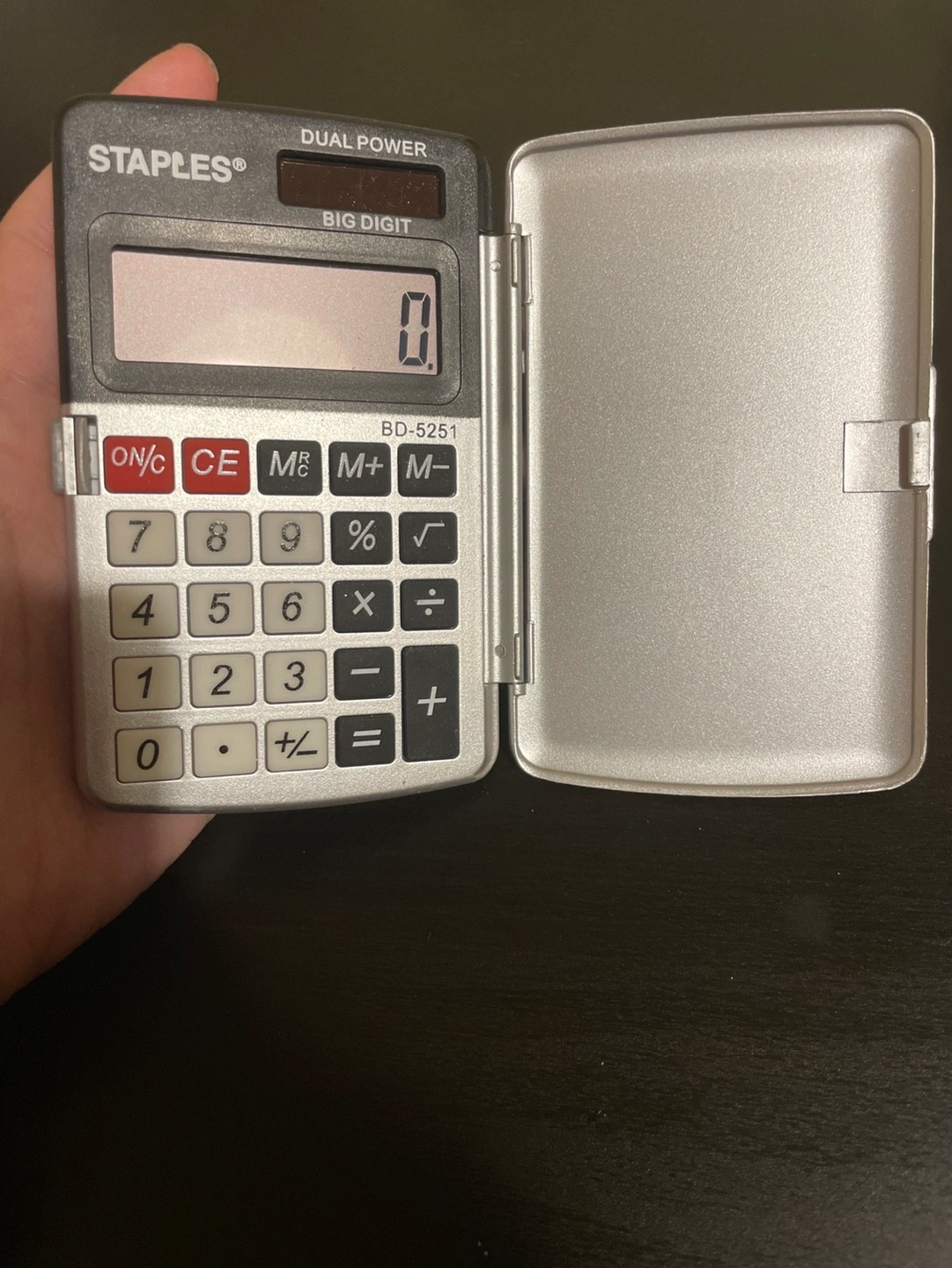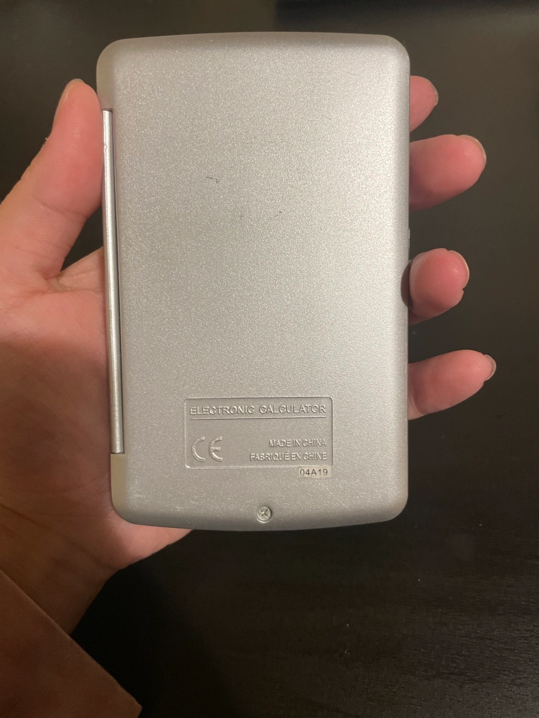 1000+Silver calculator with large display. Dual power. Includes a slide-out cover.