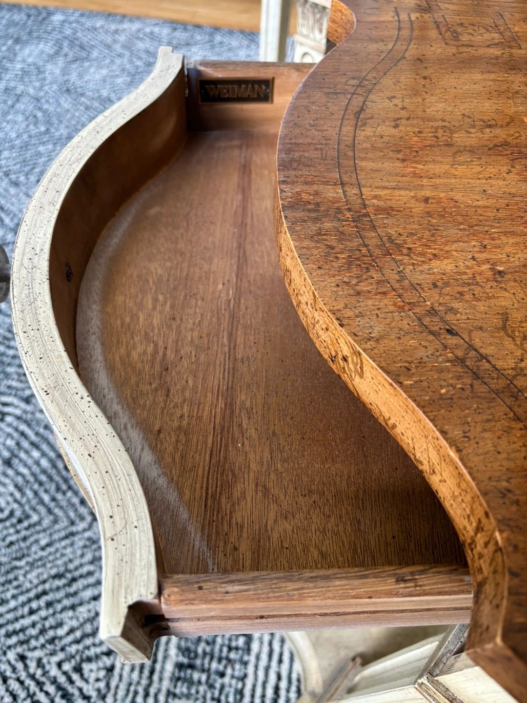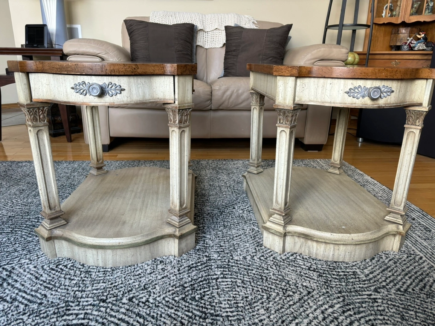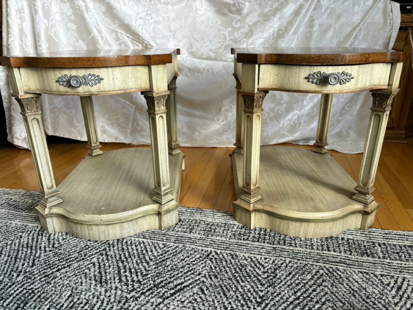 Two matching end /side tables with a single top drawer. The tables have a light wood finish.By Weiman furniture. ( numbered) Solid wood. Top wood is pecan with pickled wood finish on bottom. Last photo shows similar ones available online
