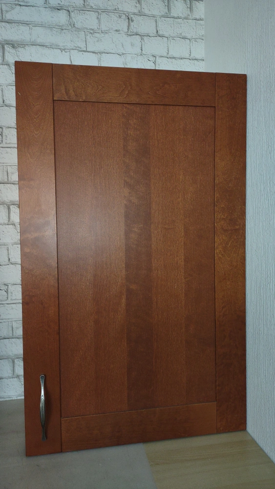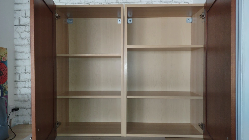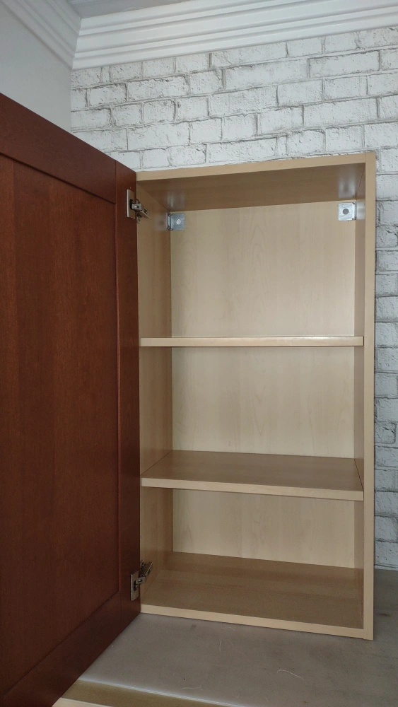 Two complete wall mounted kitchen cabinets. Cherry wood finish. Includes hardware. Was used in a closet area.