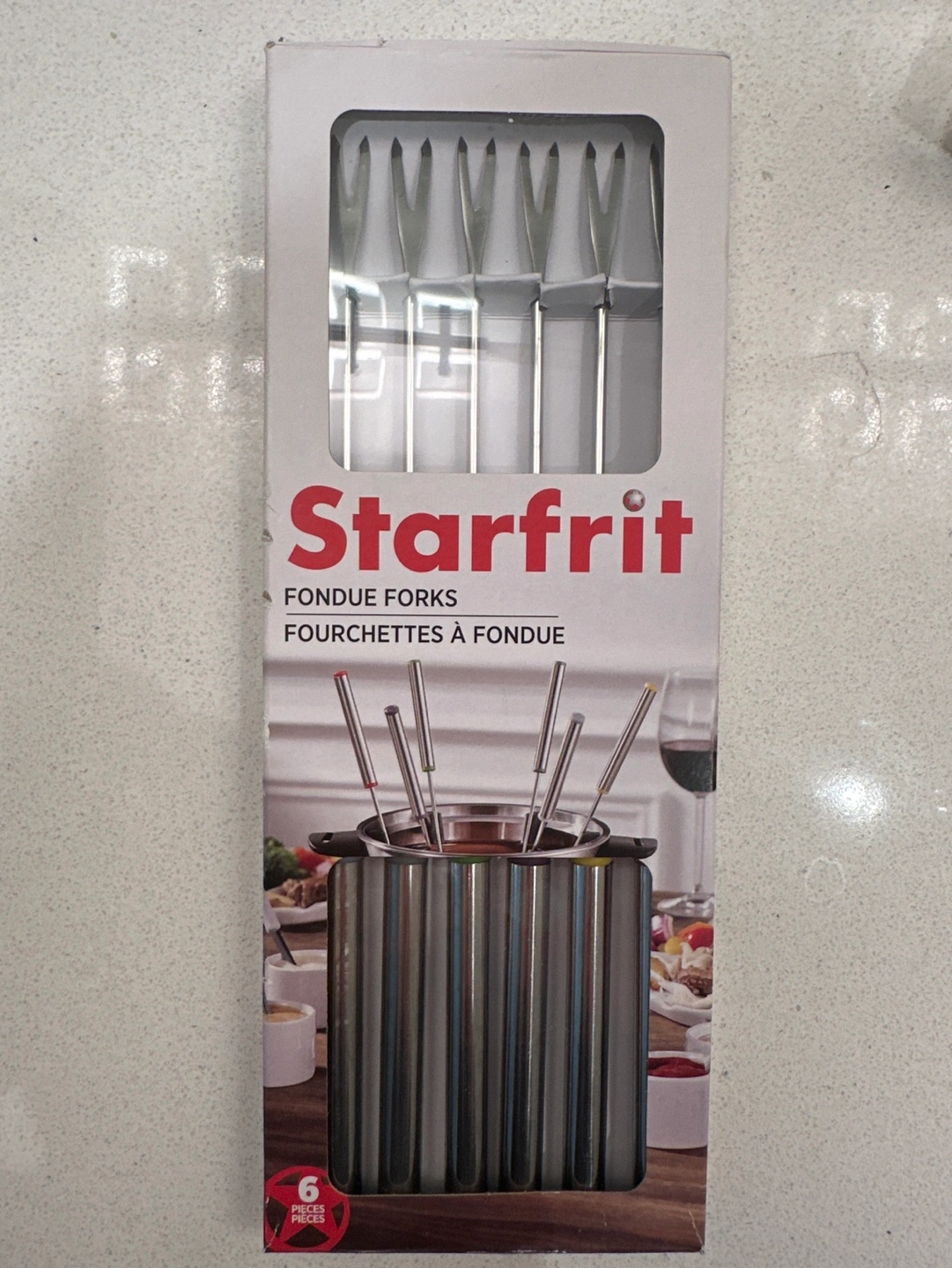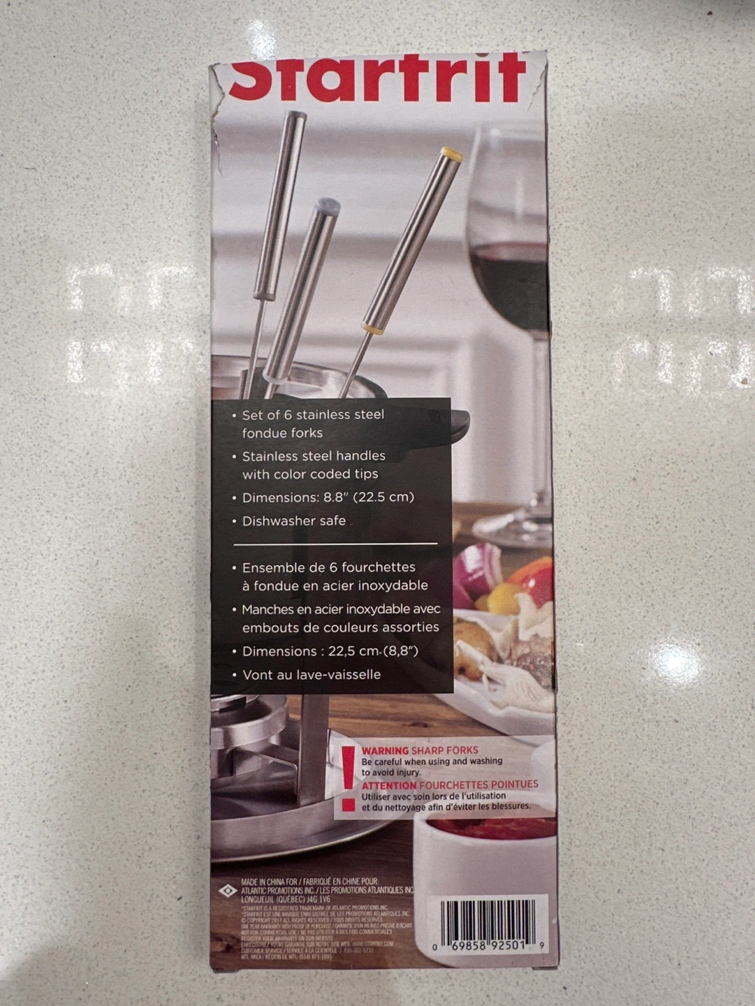 Set of 6 stainless steel fondue forks. Colour coded handles. Dishwasher safe.