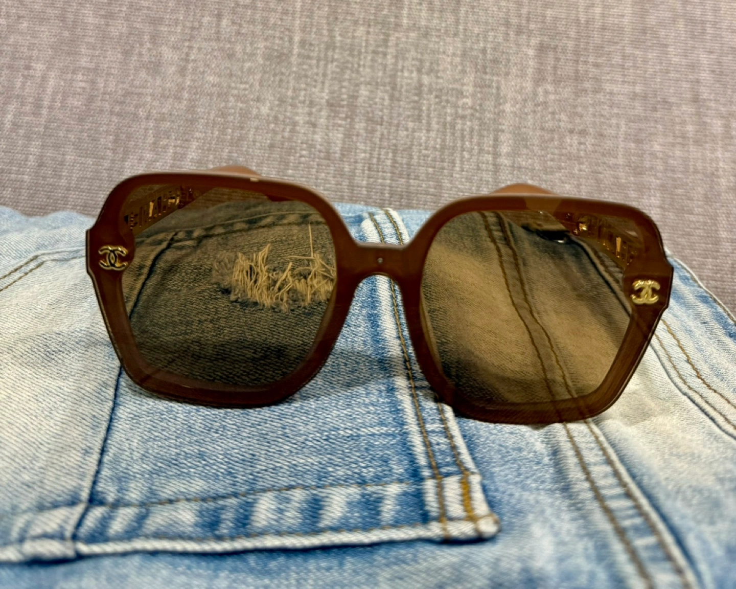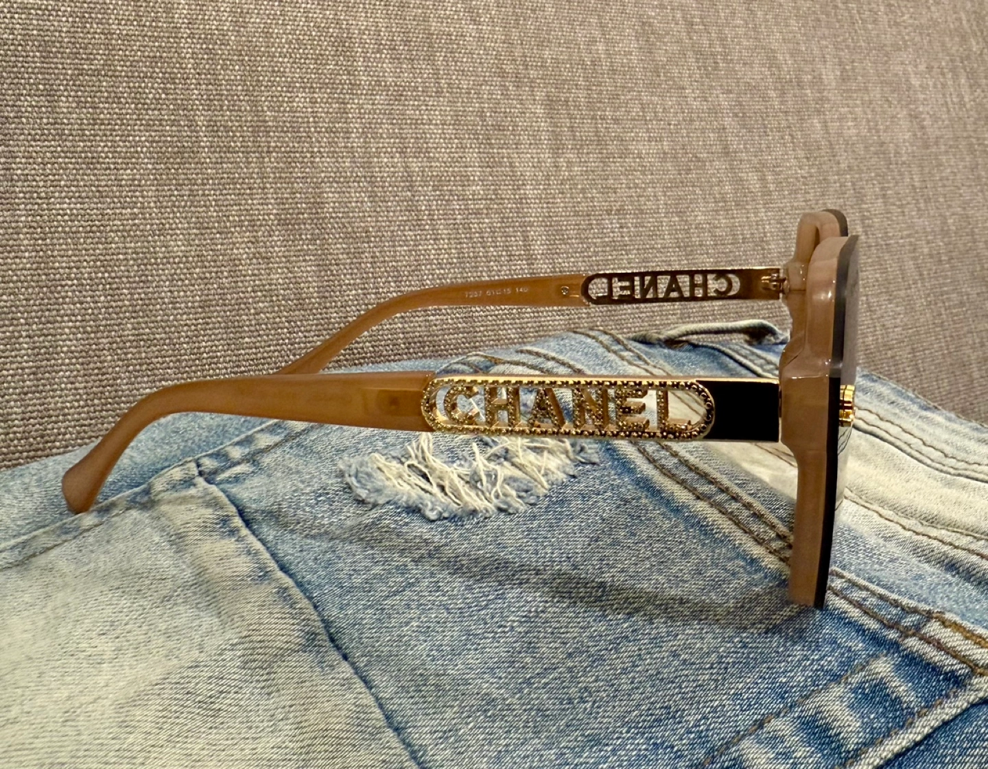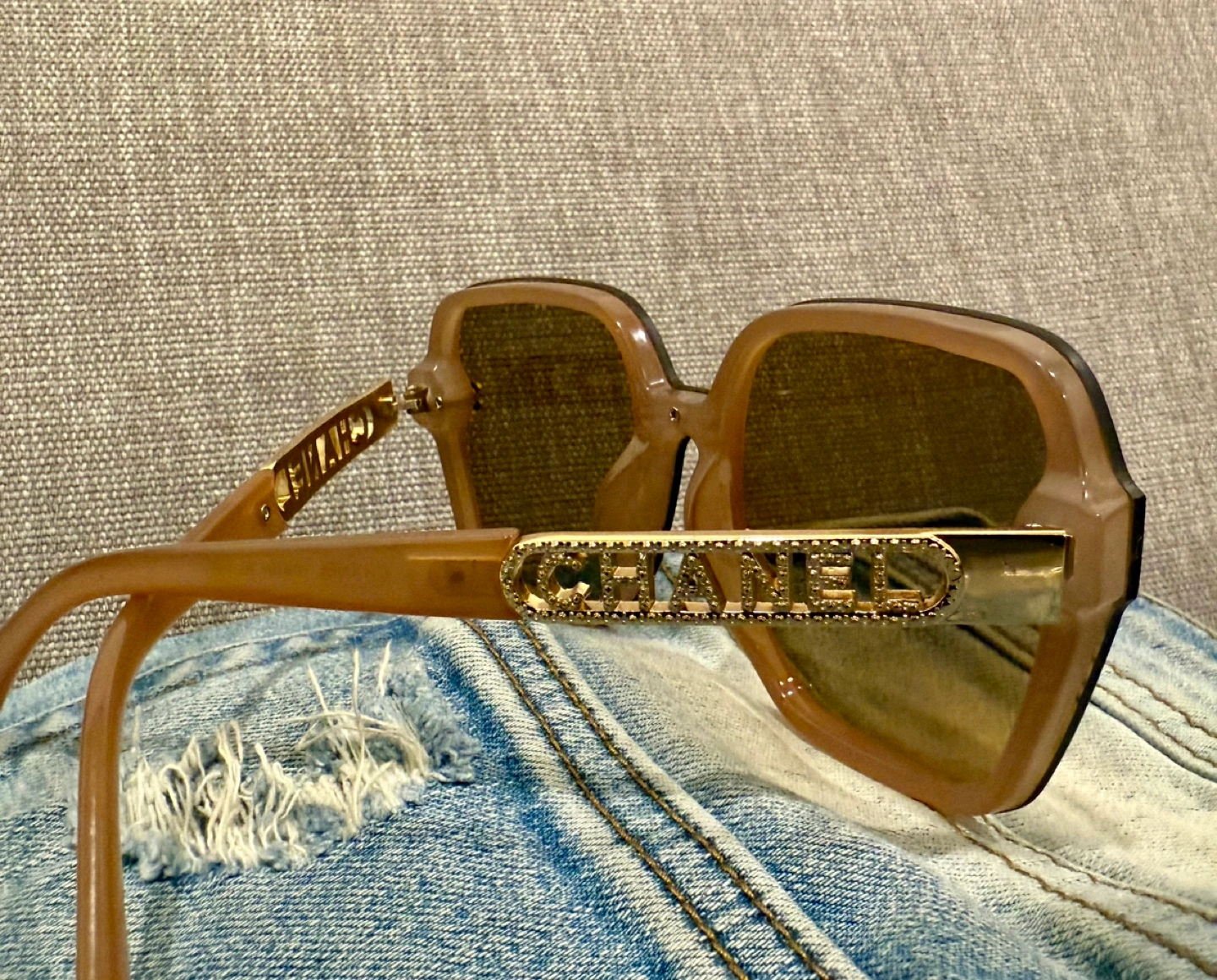Sunglasses with brown lenses and a light brown frame. The frame features a gold Chanel logo with rhinestones.