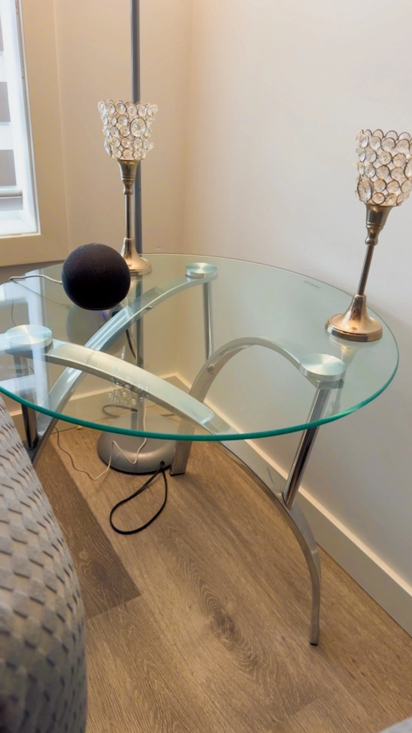 2Round glass tables with chrome legs. Great for a small space or as an accent piece. Only 5 months old selling because we are moving bought it for $550 for 2 but selling it for $400and it is absolutely in new condition it is sets of 2