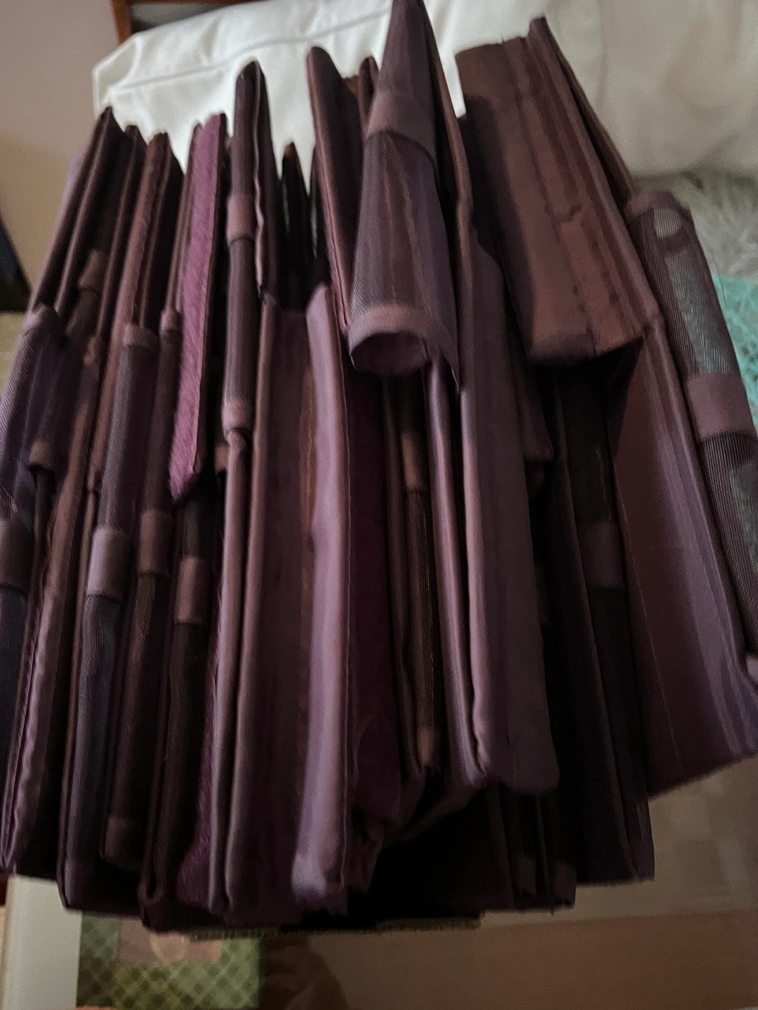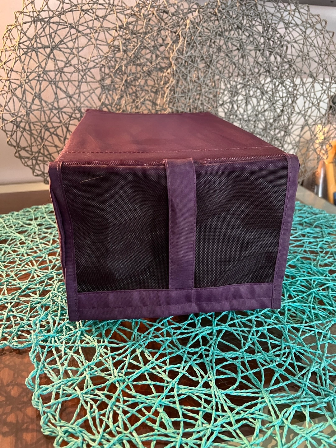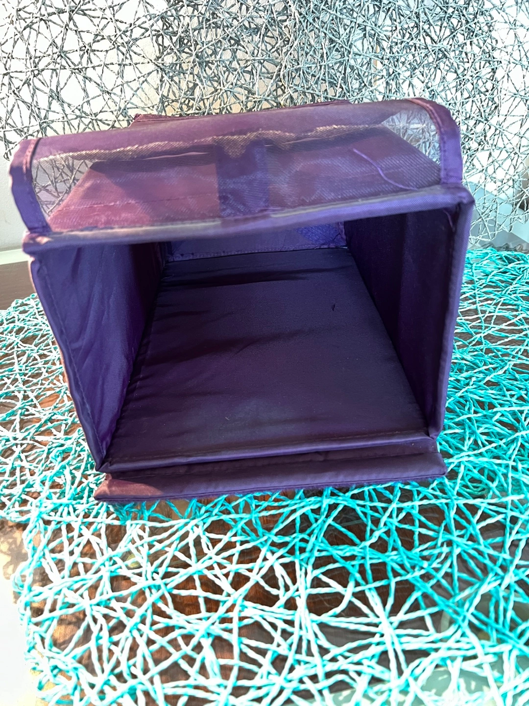 Purple shoe box with a lid. Mesh window on one side. Great for storing shoes or other items in your closet or under your bed.