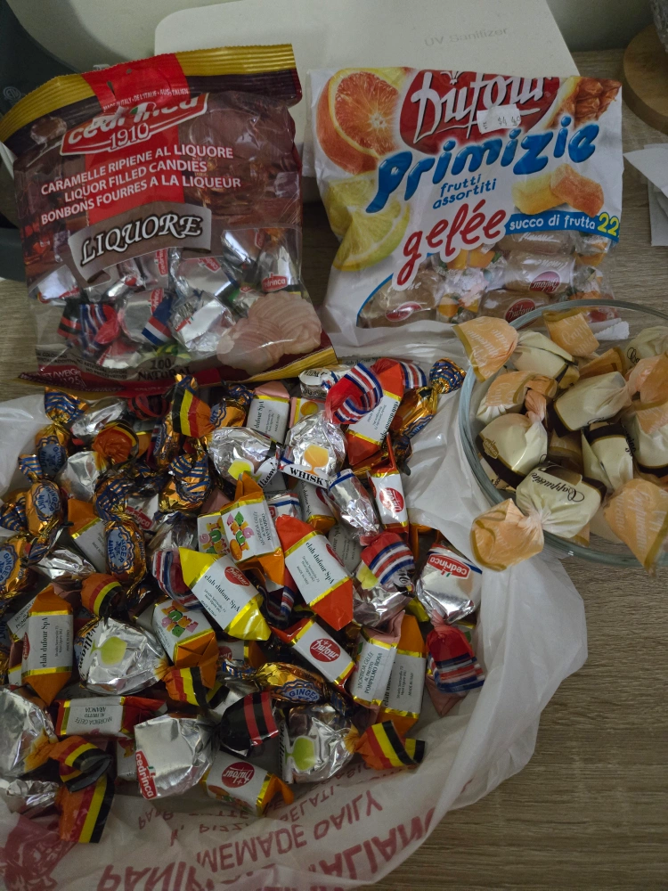 Bag of assorted Italian candies. Includes liqueur-filled candies, jelly candies and hard candies. Variety of flavours.