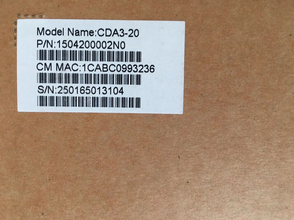 Black modem with a grid pattern on the back. Model name: CDA3-20.