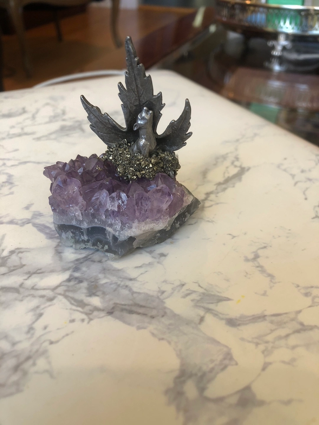 Small pewter wolf figurine with an amethyst crystal base. The wolf is howling, with a maple leaf sprouting from its back. The crystal has some pyrite inclusions. It's approximately 3 inches tall.