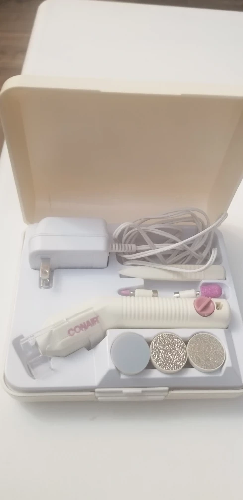 Electric manicure set in a carrying case. Includes a power adapter, cord, and several attachments.
