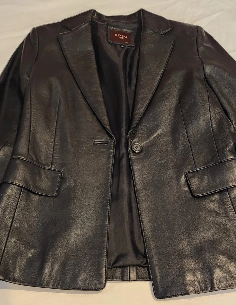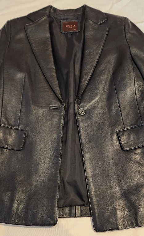 Black leather jacket with a single button closure.