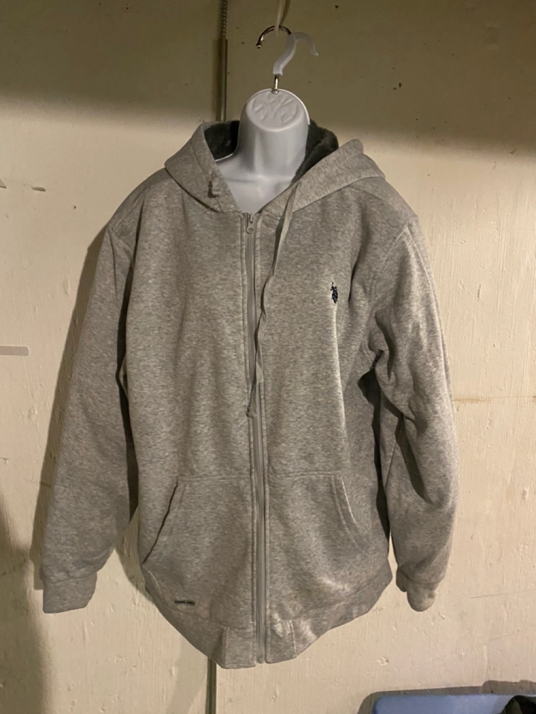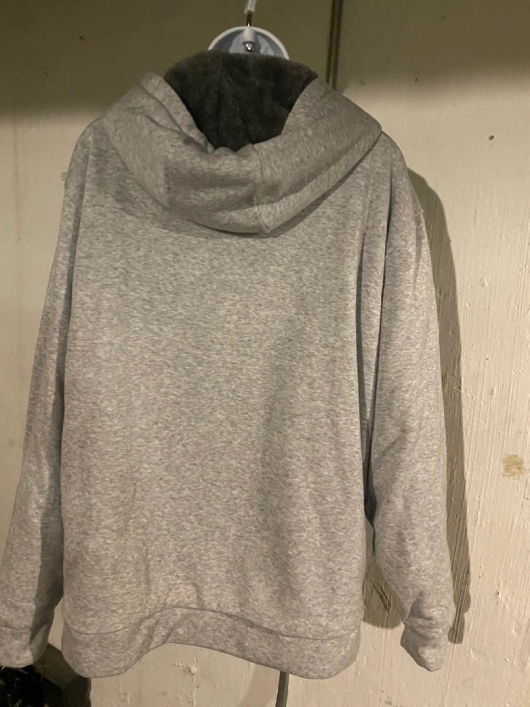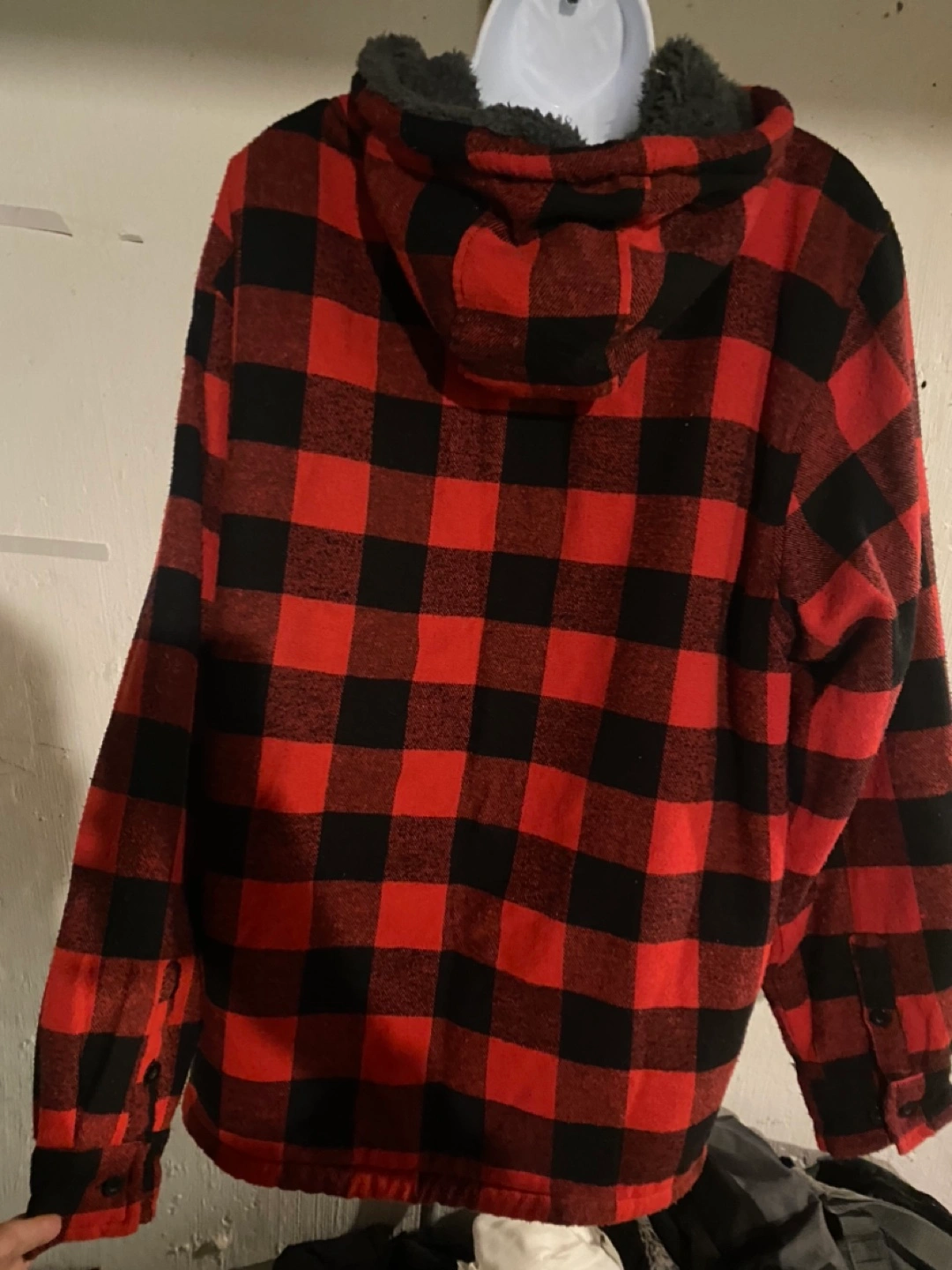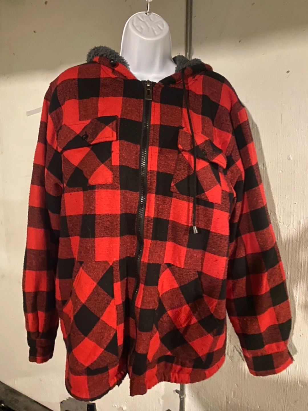 Red and black plaid flannel lined zip up hoodie. Has a grey fleece lining inside the hood. Two front pockets. Button cuffs.