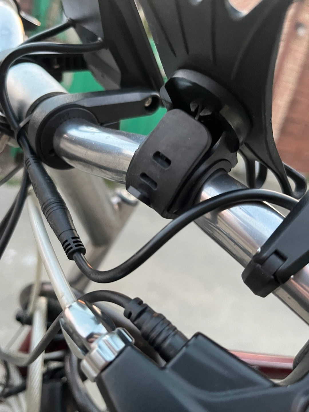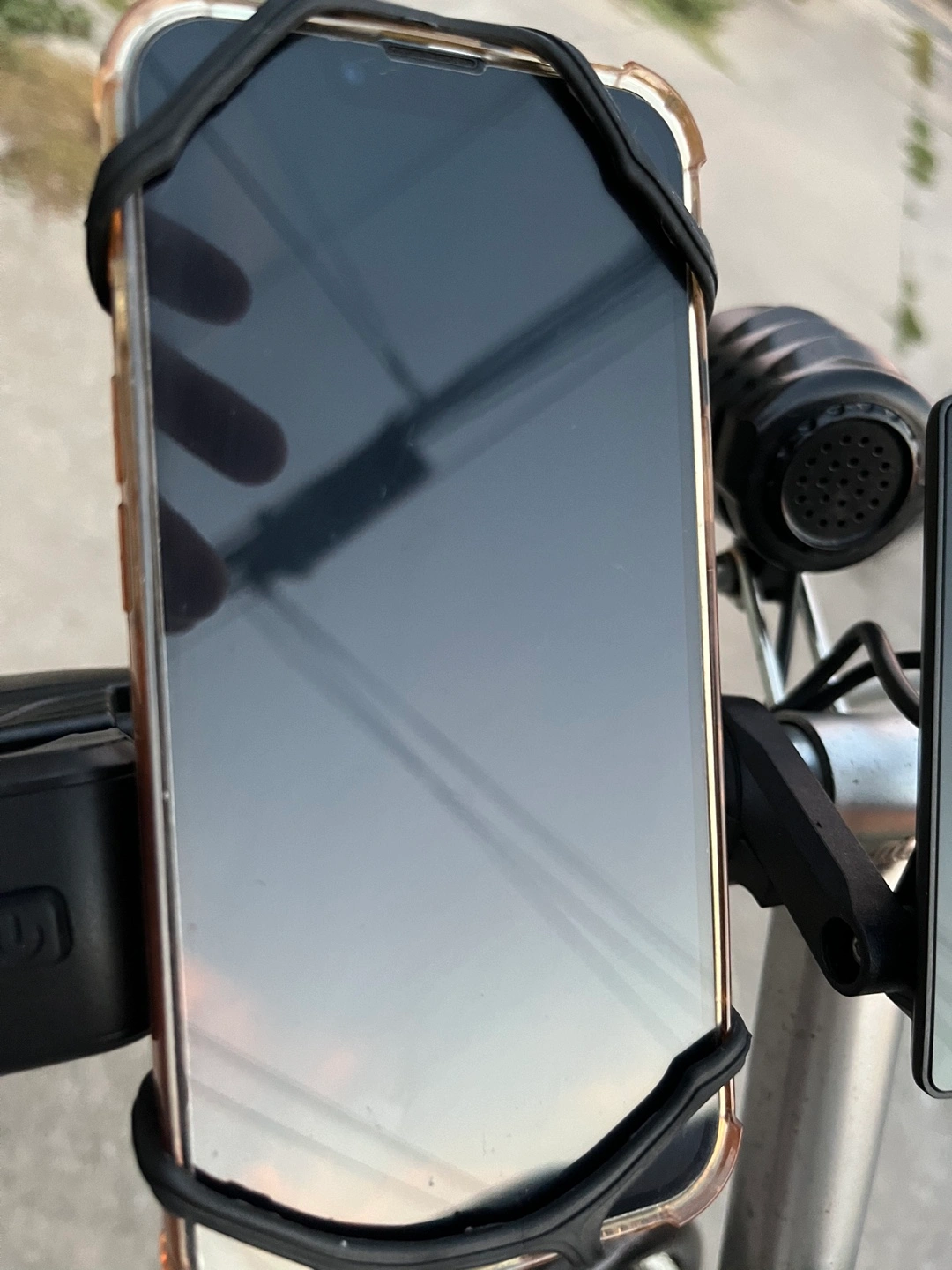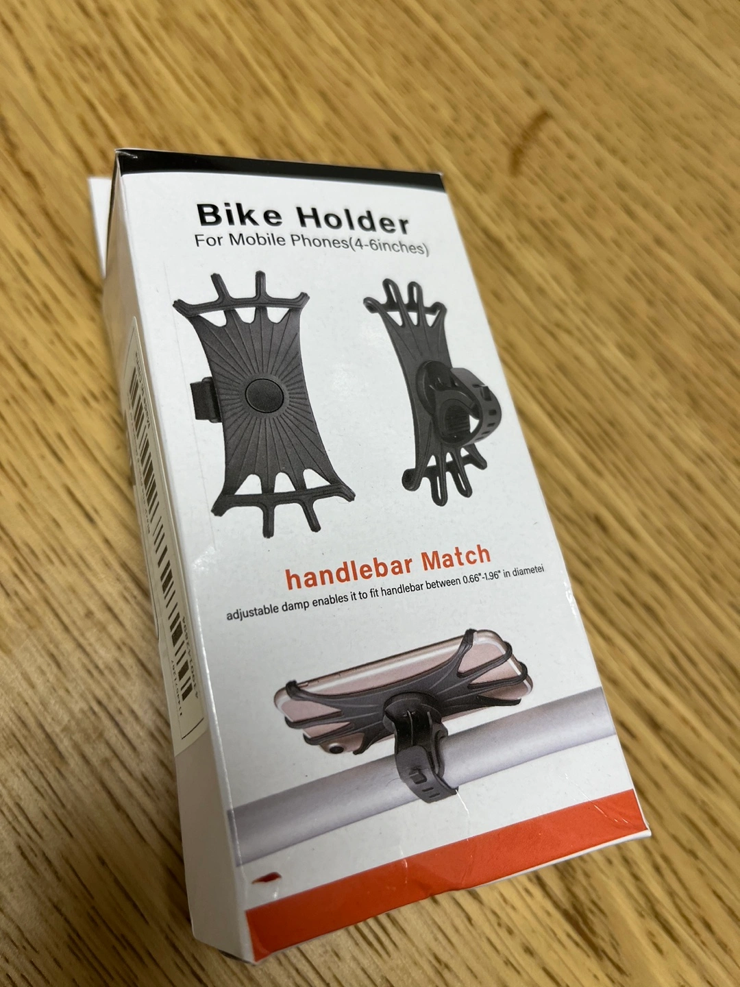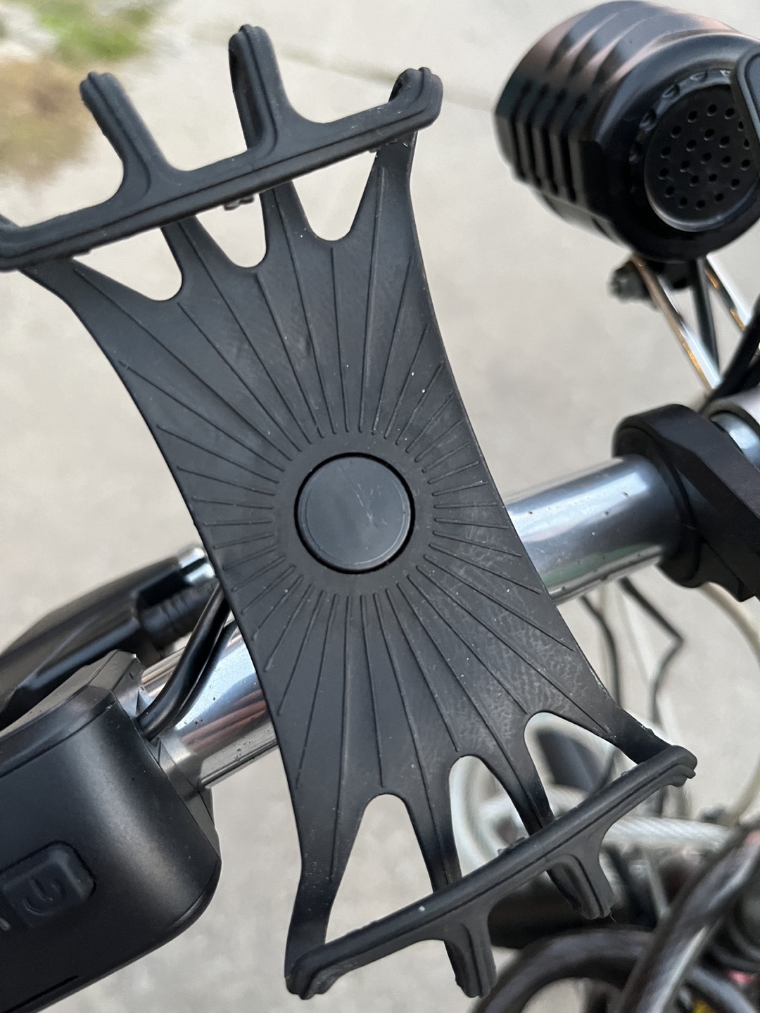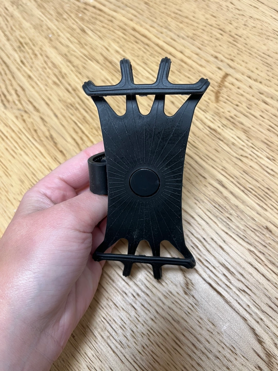 Black phone holder for bike handlebars. Adjustable to fit handlebars between 0.6-1.8 inches in diameter. Holds phones 4-6 inches.