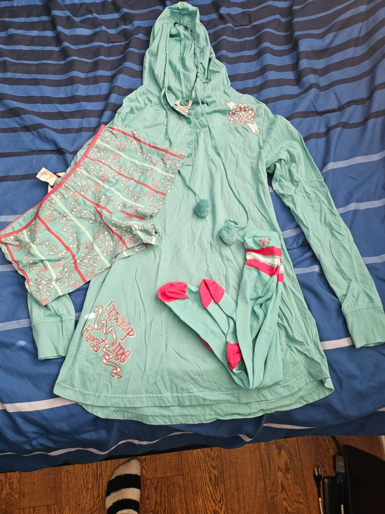 Mint green long-sleeved hooded top with pink and white striped socks and a pair of matching pyjama bottoms.