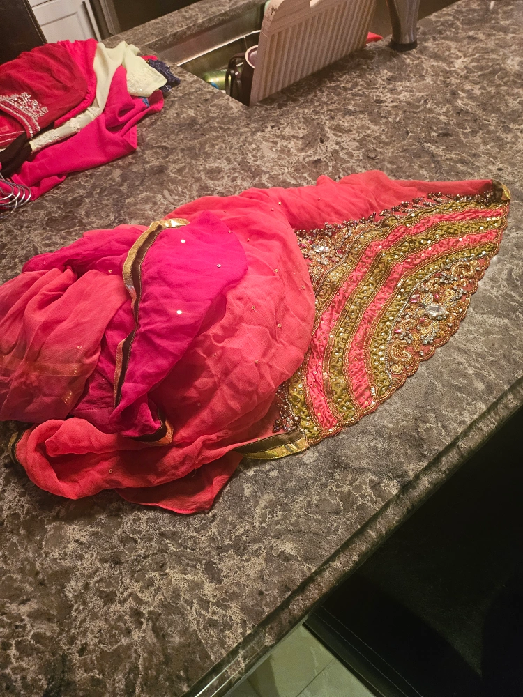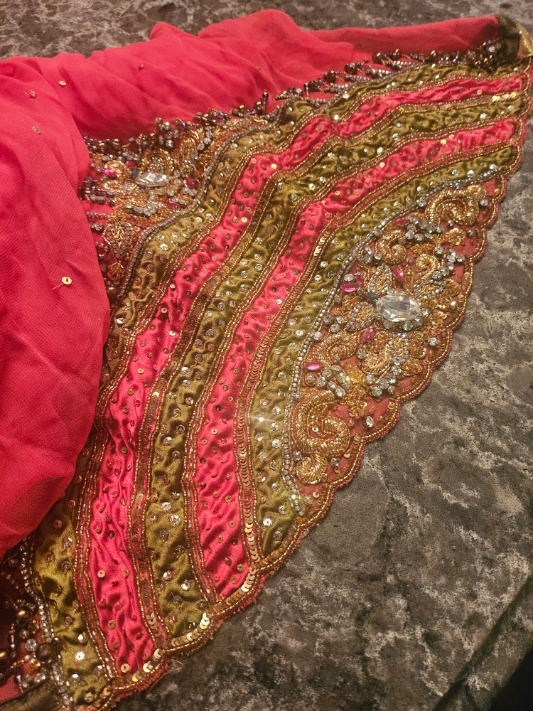 Gorgeous red and gold sari with intricate embroidery. The sari has a delicate chiffon fabric and features beaded embellishments. It is perfect for a special occasion.