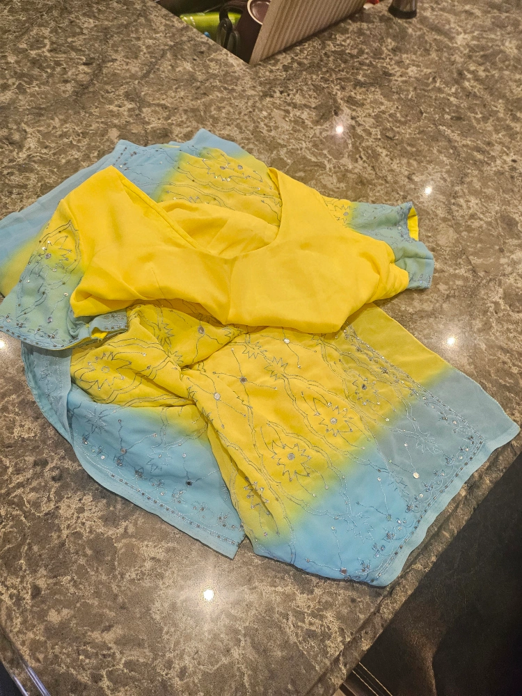 68Yellow and blue sari with embroidery and sequins. Sleeveless top included.