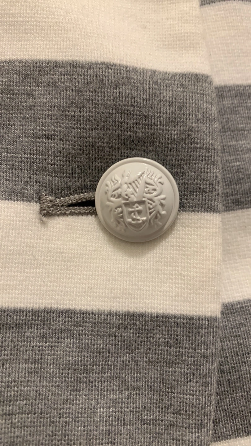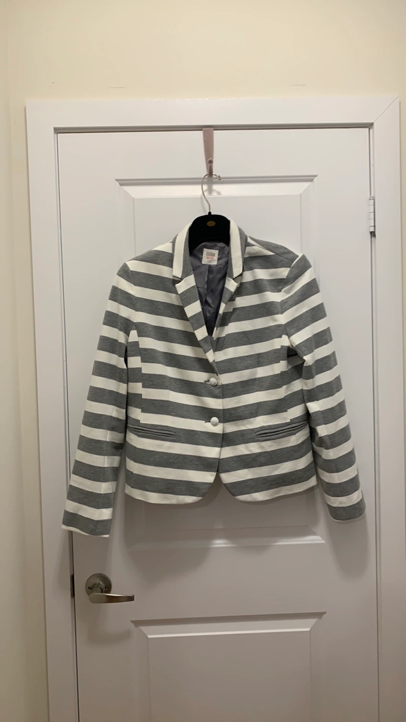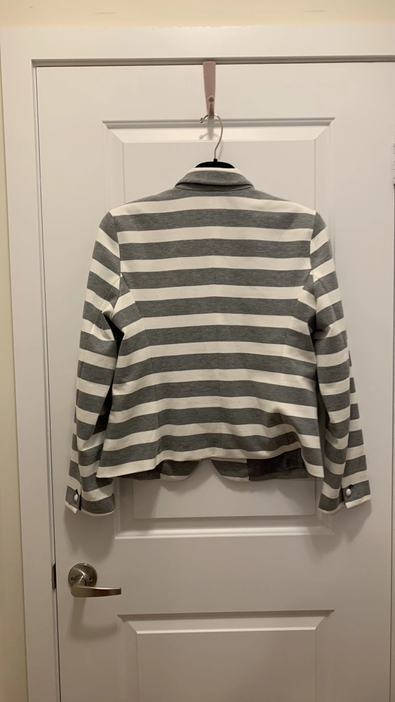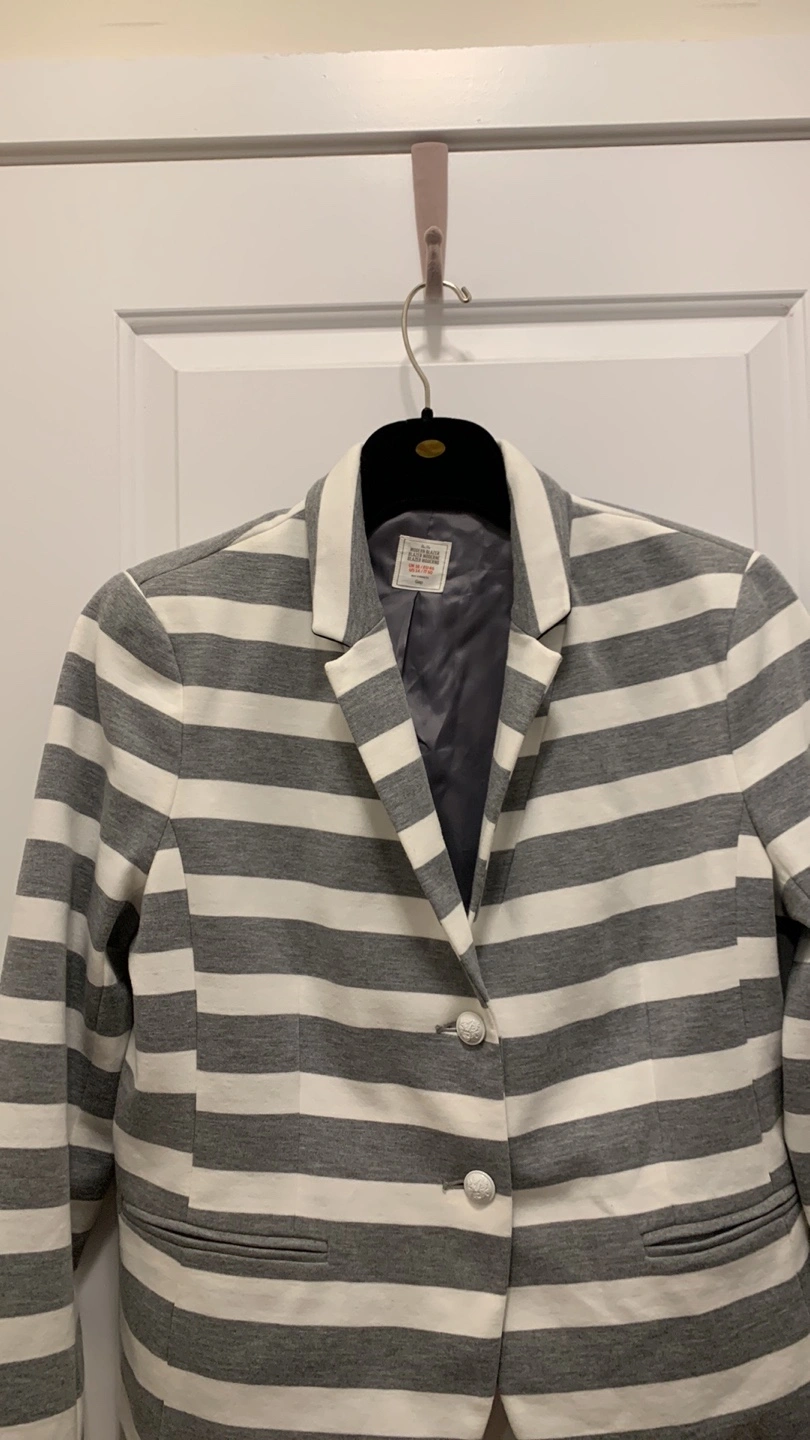 Grey and white striped blazer. Two button closure. Long sleeves.