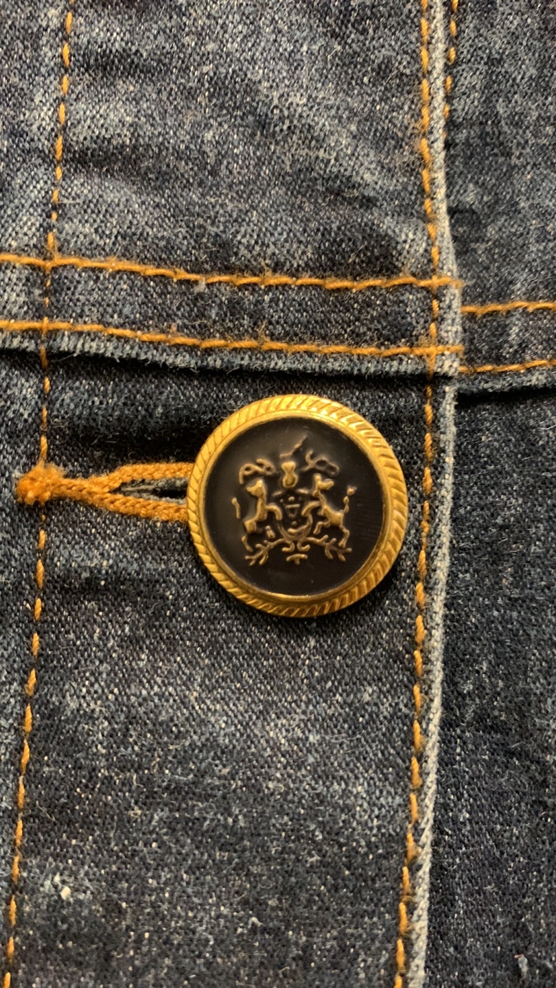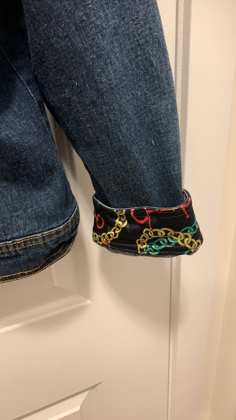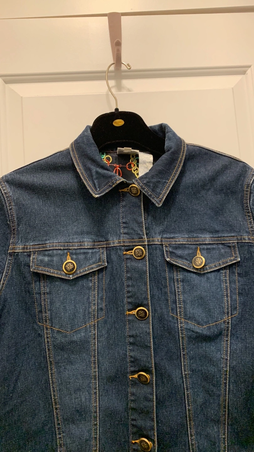 Blue jean jacket with a colourful chain print lining inside. Gold buttons with a crest design.