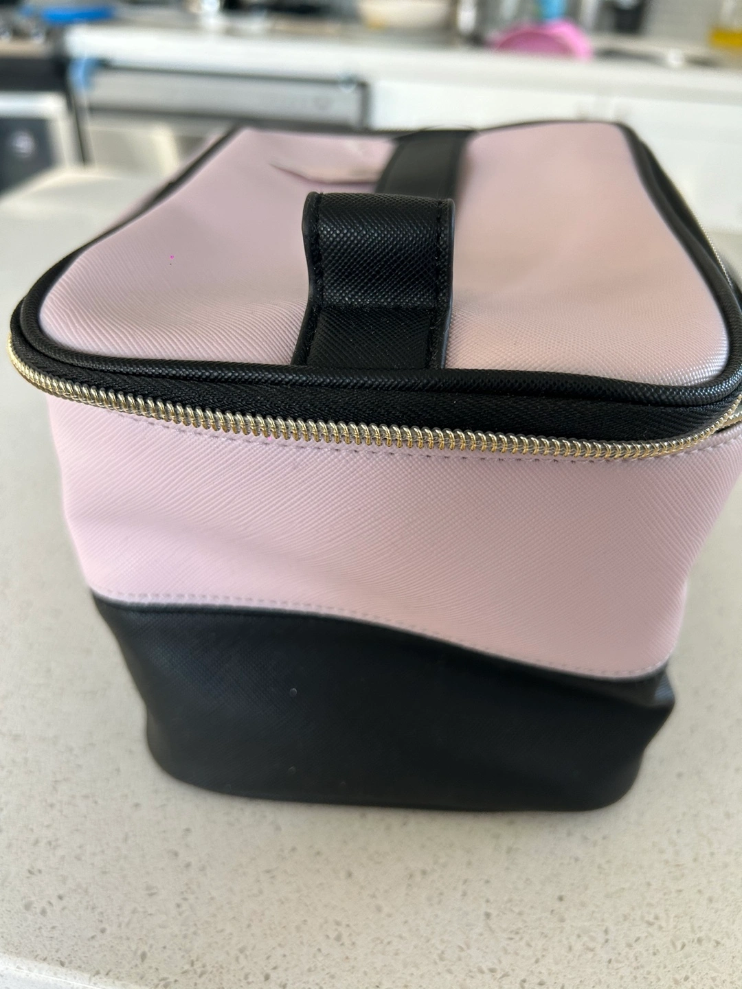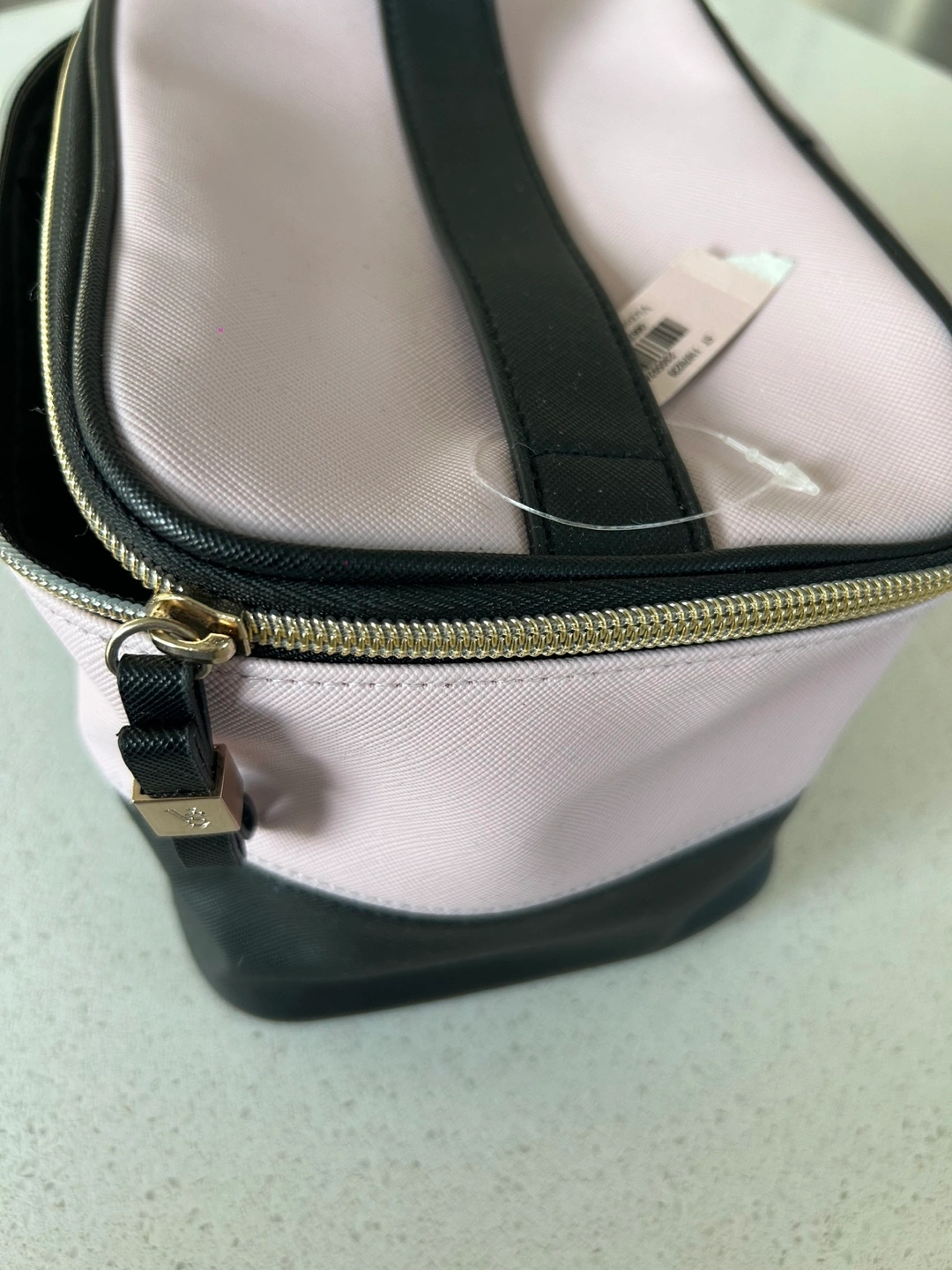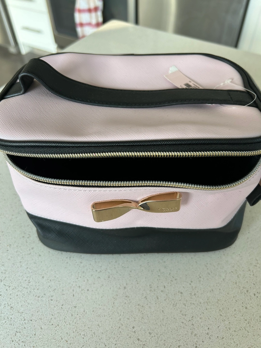 Pink and black makeup/vanity bag with gold zipper and bow accents. New with tag.