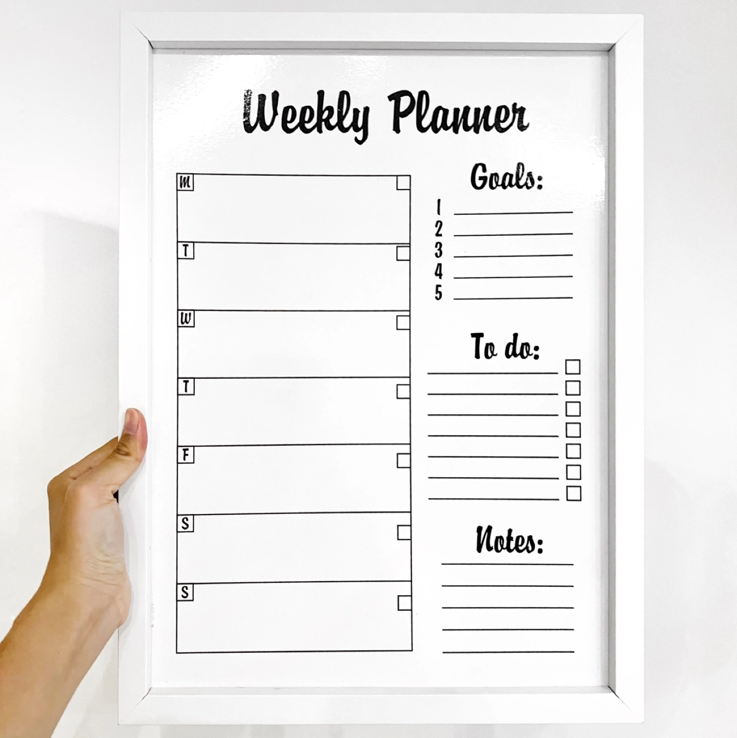 White framed weekly planner dry erase board. Includes a space for goals, to-do list, notes. Markers not included. Can be hung up on the back or can lean against a wall on a desk.