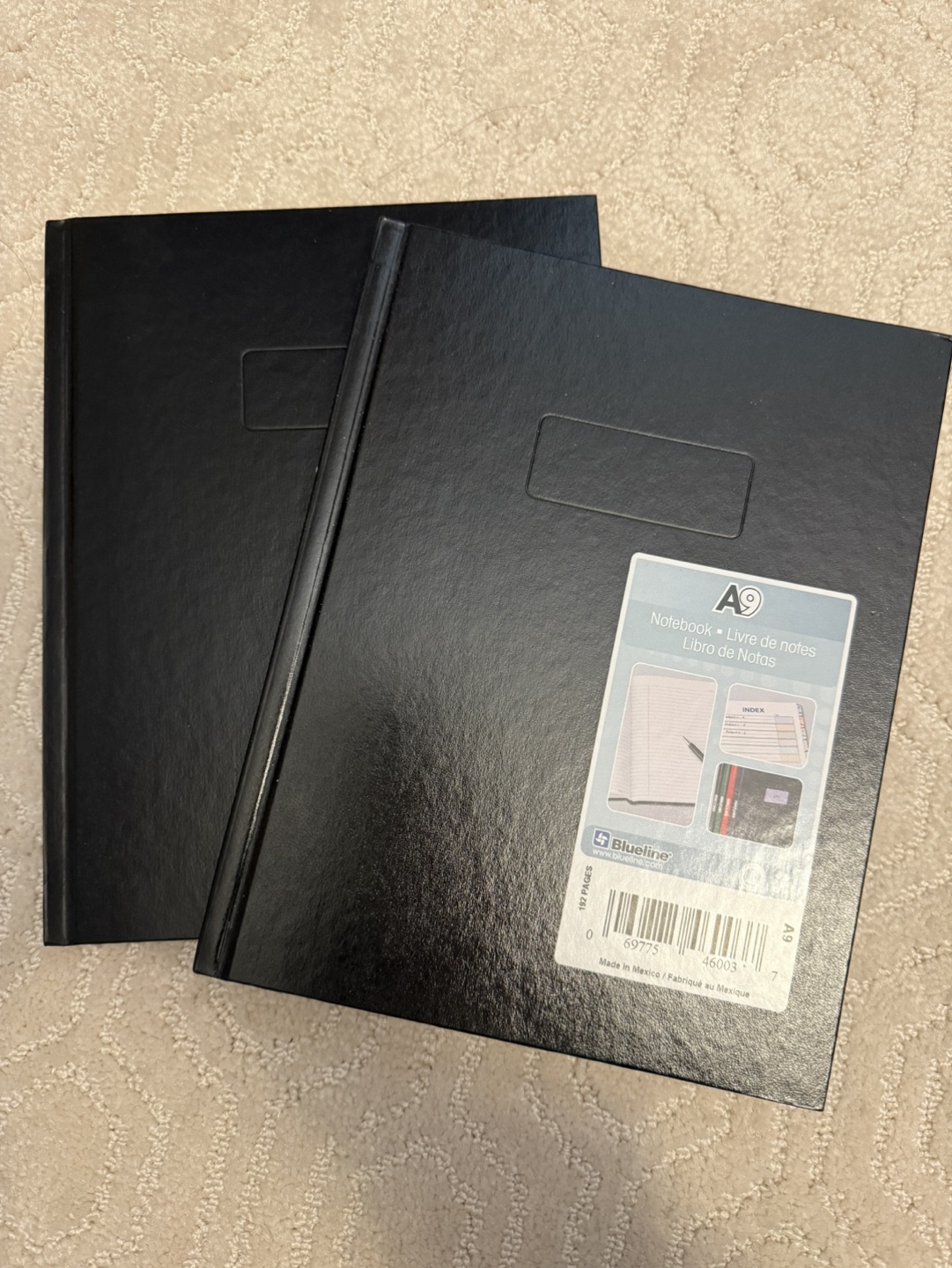 Hardcover black notebook, 150 pages. Two notebooks included. Perfect as lab notebooks, as it includes margins for page numbers and dates.