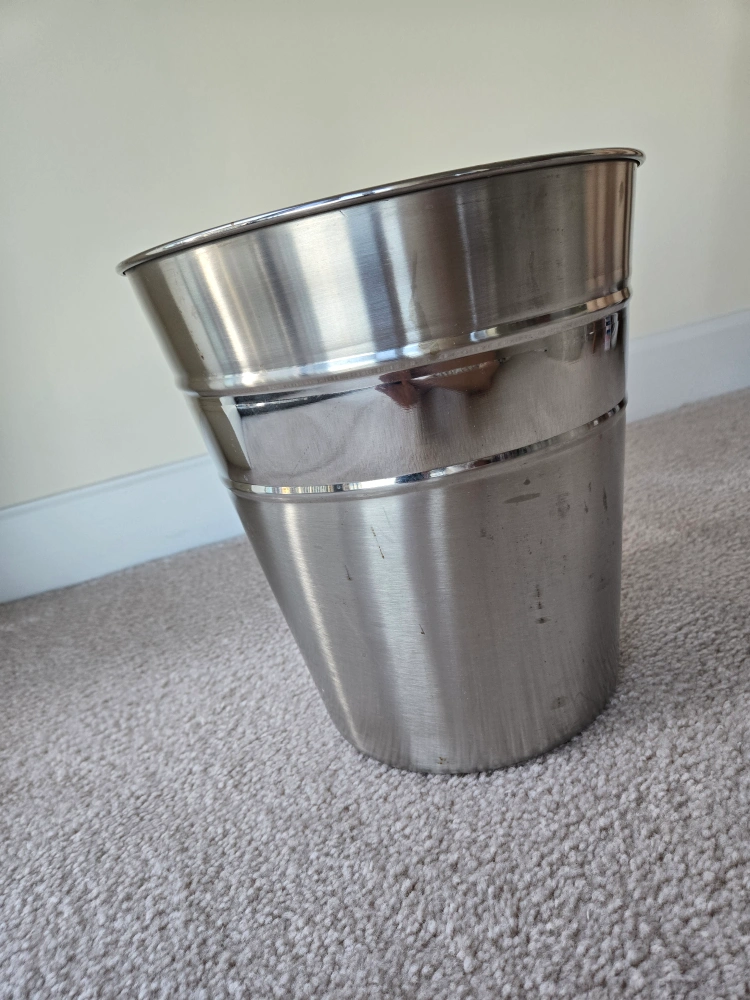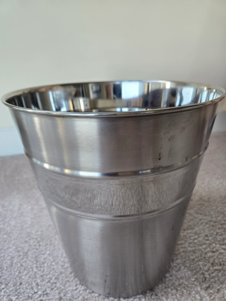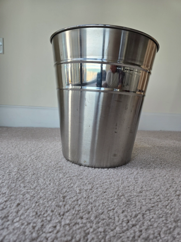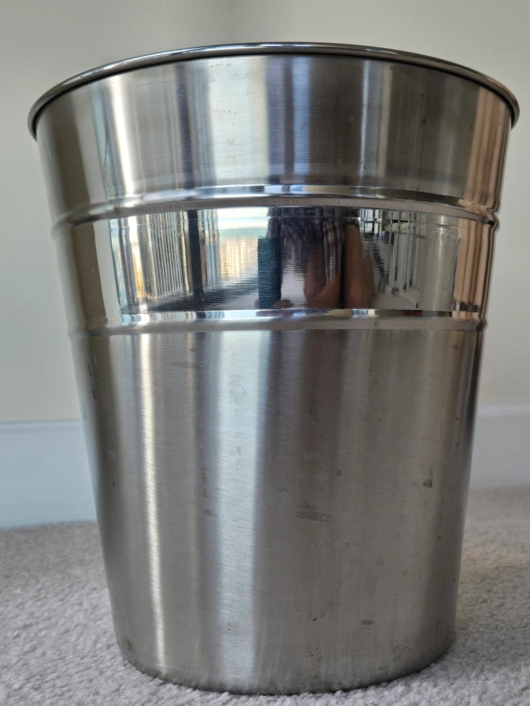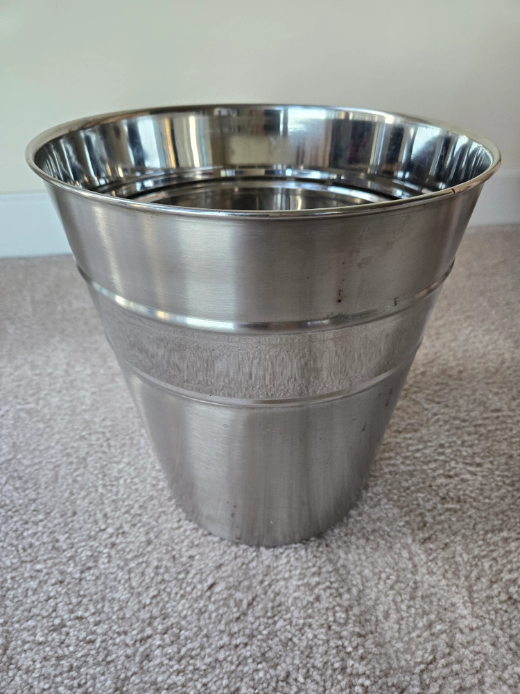 Stainless steel trash can. Good condition. No lid. This Stainless steel trash can has been used, but it is still in good condition. It has been thoroughly cleaned using dishwasher.