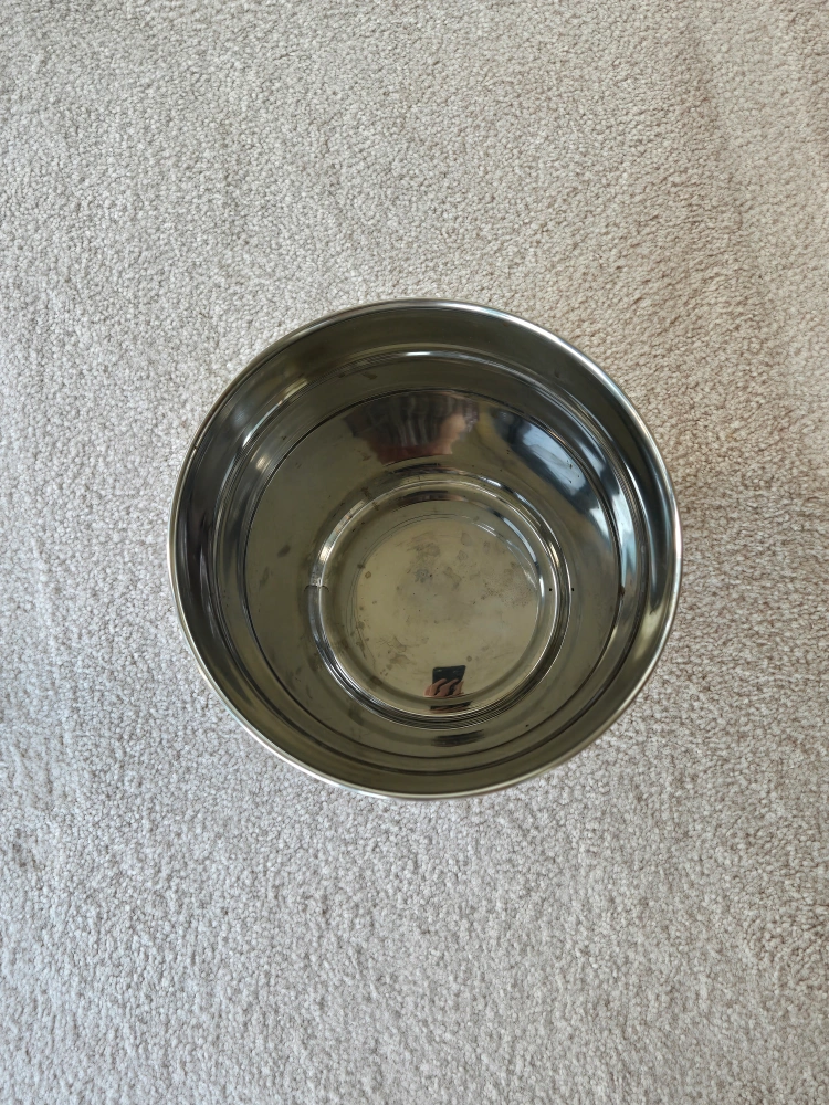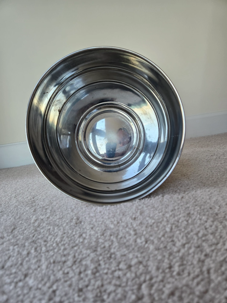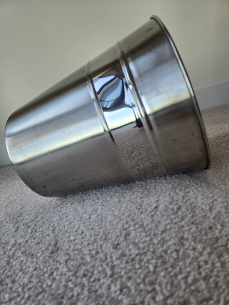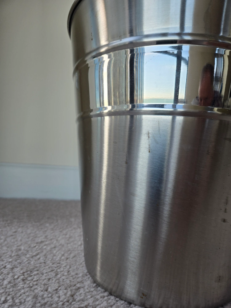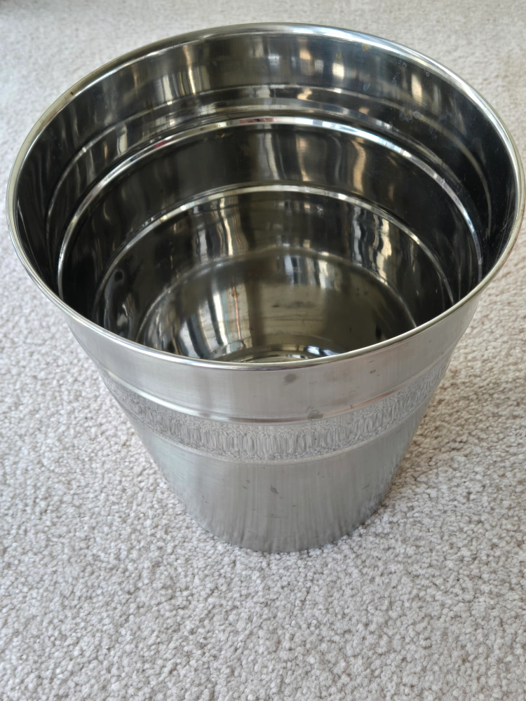 Stainless steel trash can. Good condition. No lid. This Stainless steel trash can has been used, but it is still in good condition. It has been thoroughly cleaned using dishwasher.