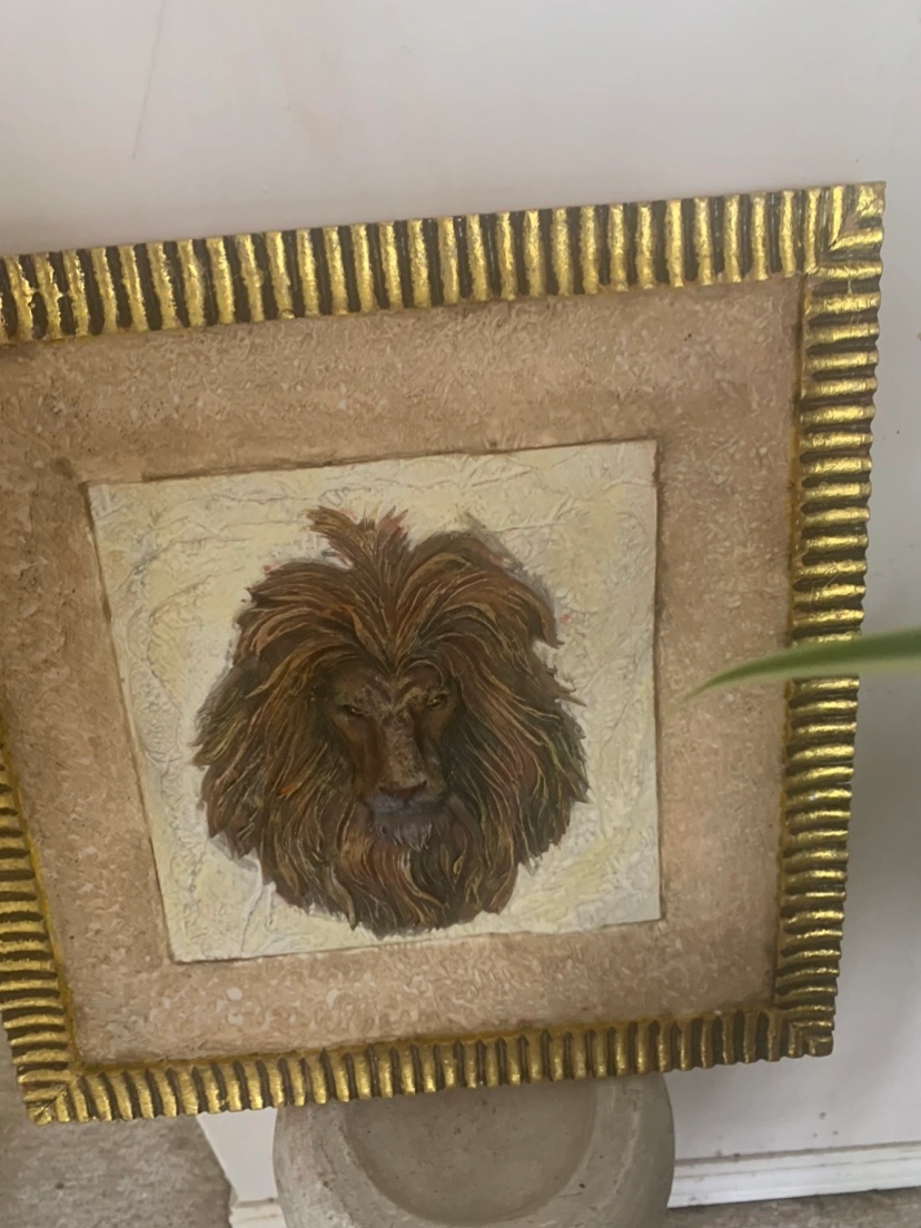 New ,, wall art / Carved in stone portrait of a Lions’ head -( 3D ) lightly coloured with painted golden frame - Hooks attached on the back — Couldn’t list a price of 0$ but it’s free for # FREECYCLE.