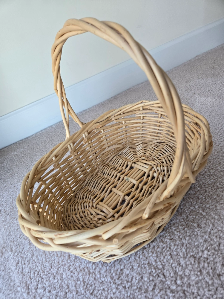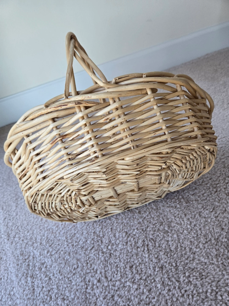 Oval wicker basket with a single handle. Good condition.