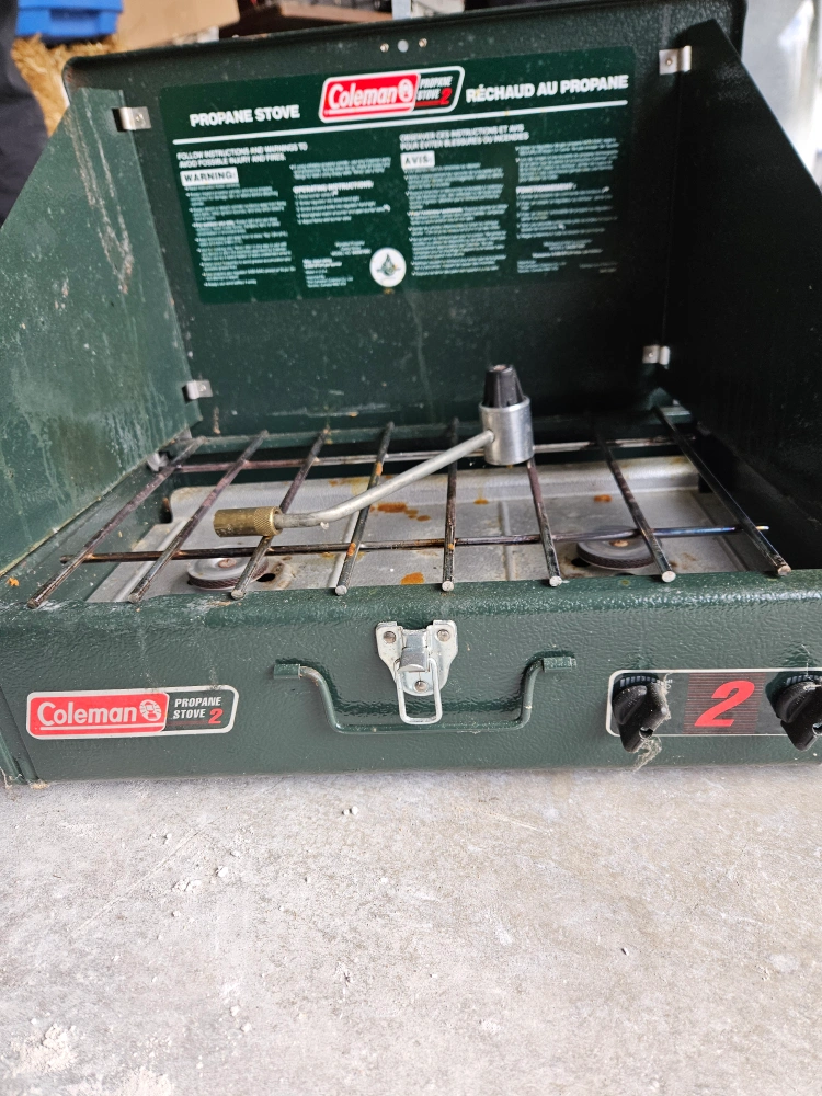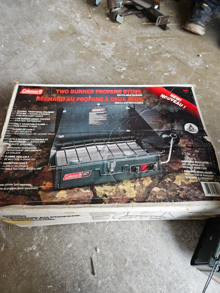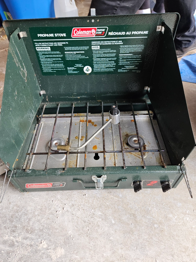 Two burner Coleman propane stove, in good used condition. Includes the wind screen. No propane tank included. Original box.