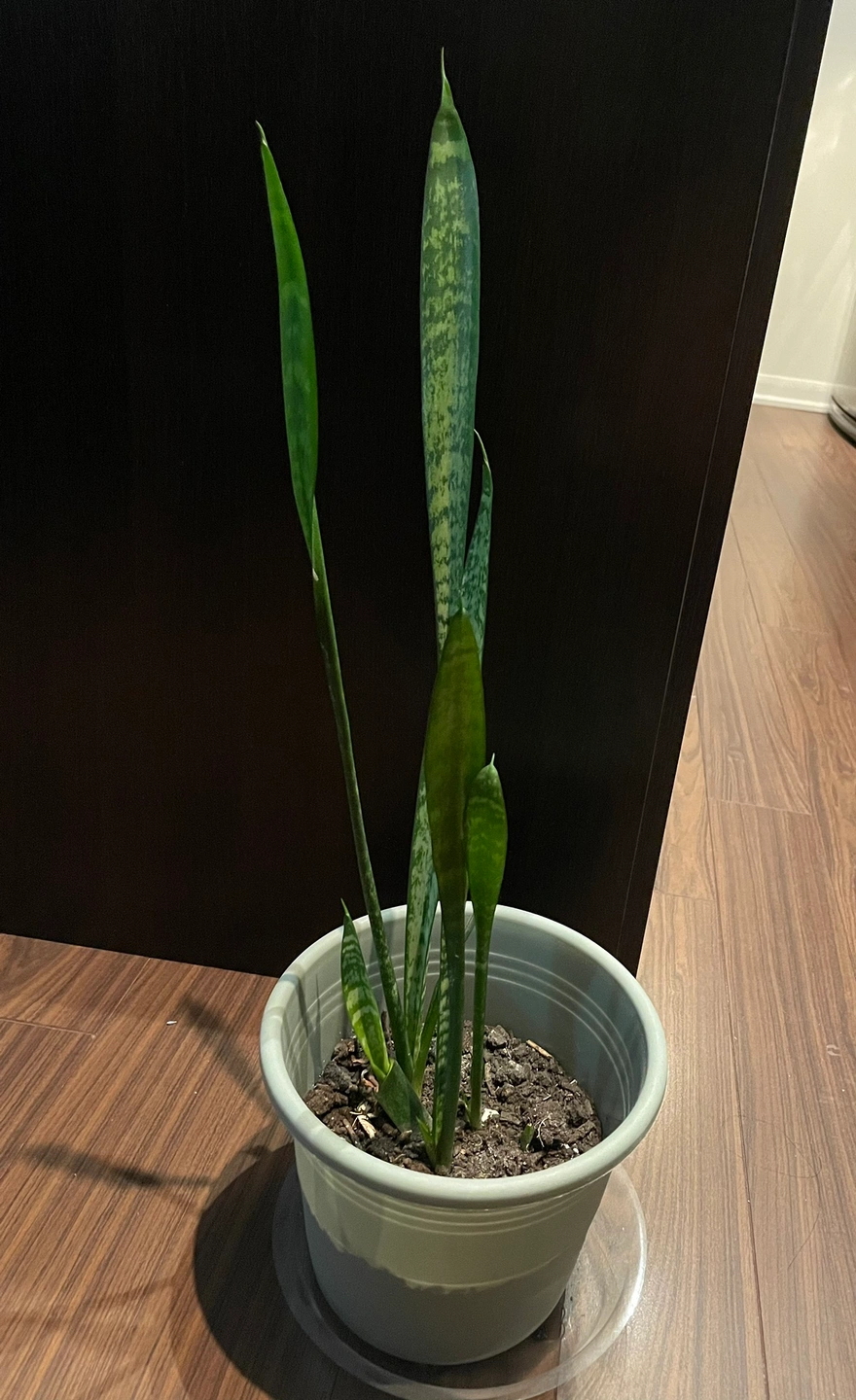 Snake plant in a plastic pot, with a saucer. Healthy plant, no bugs. About 22” in height.