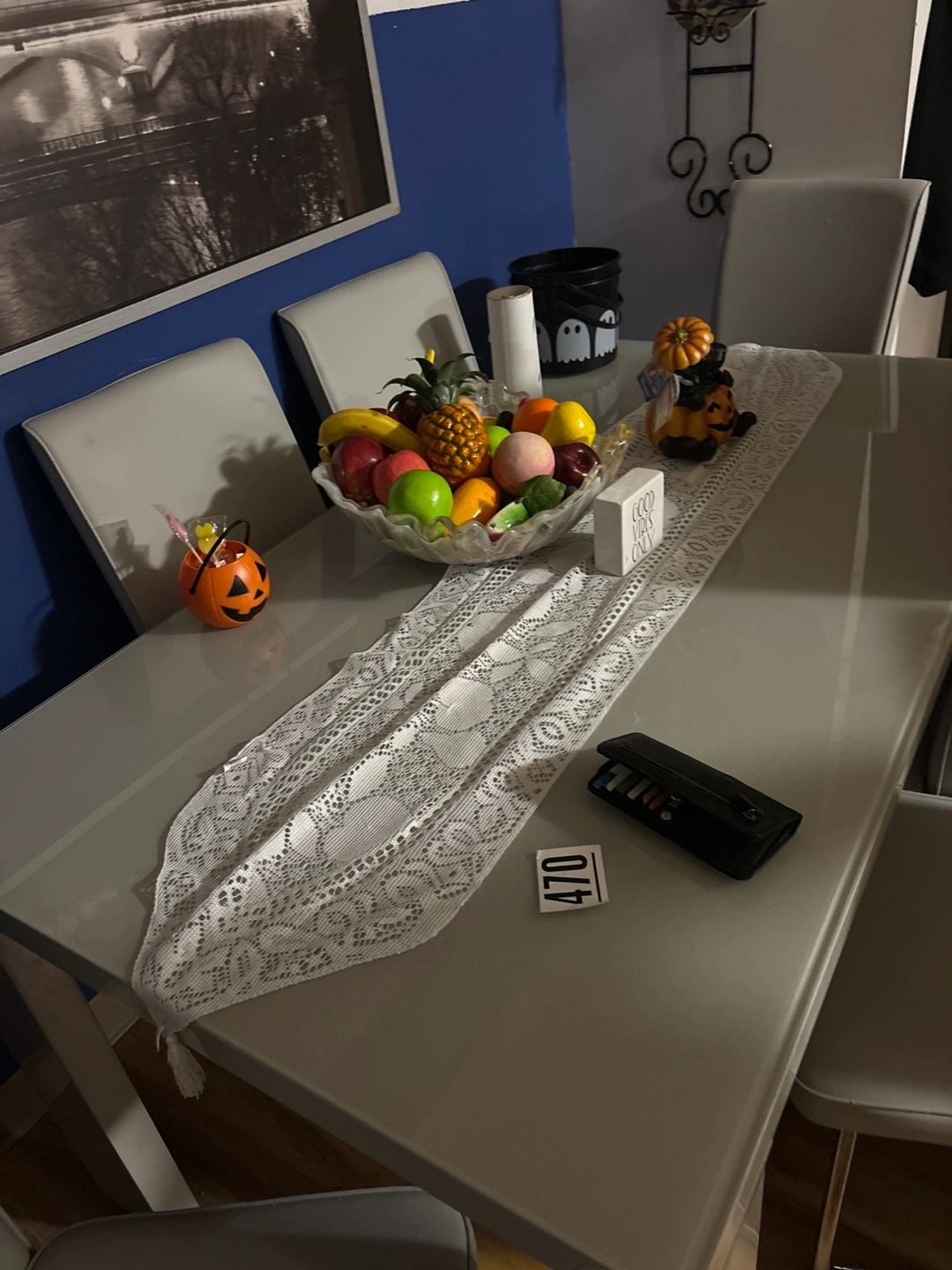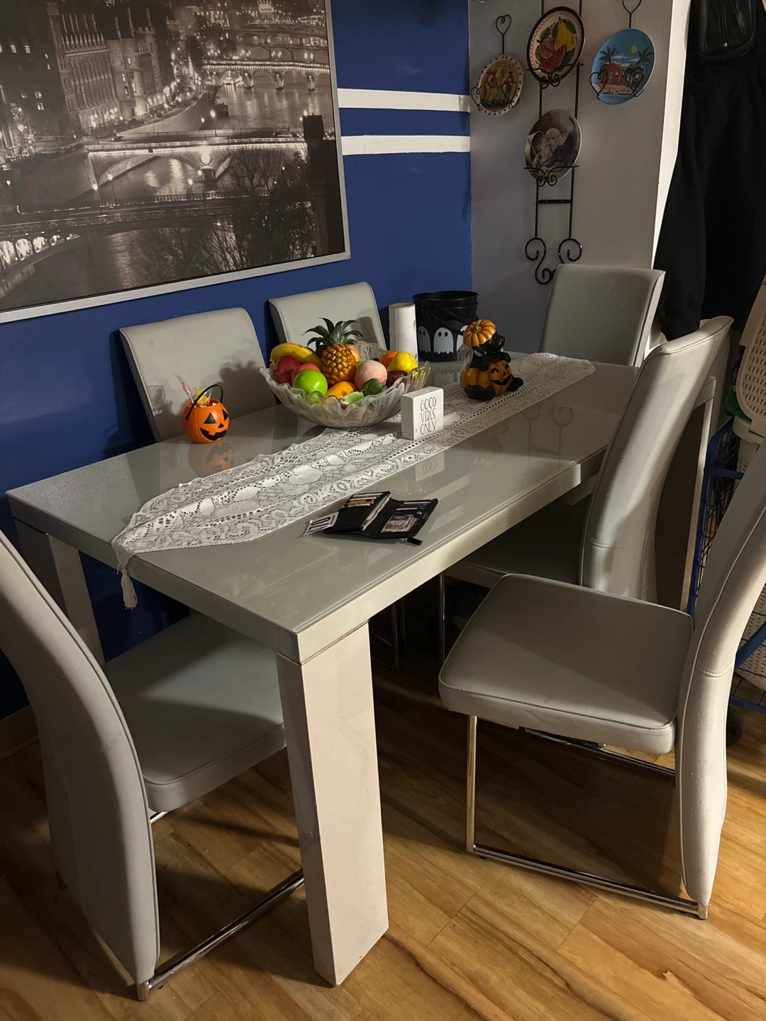 Glass top dining table with white base. Set includes 6 chairs with gray upholstered seats. The chairs have chrome legs.