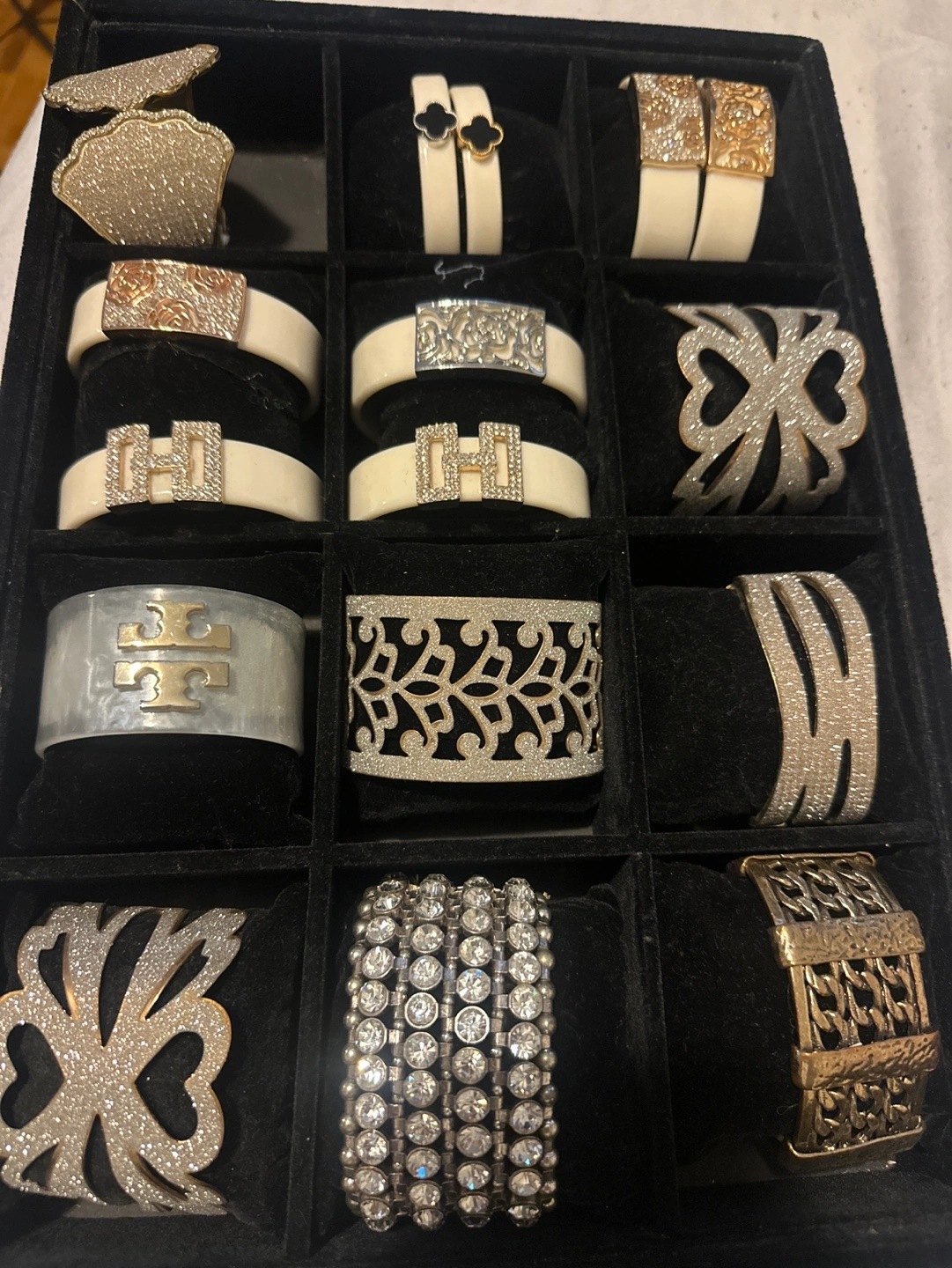 Set of 15 designer bracelets. Various styles and designs. All in good condition. Some include a logo. $15 each or 2 for $25 or 3 for $35