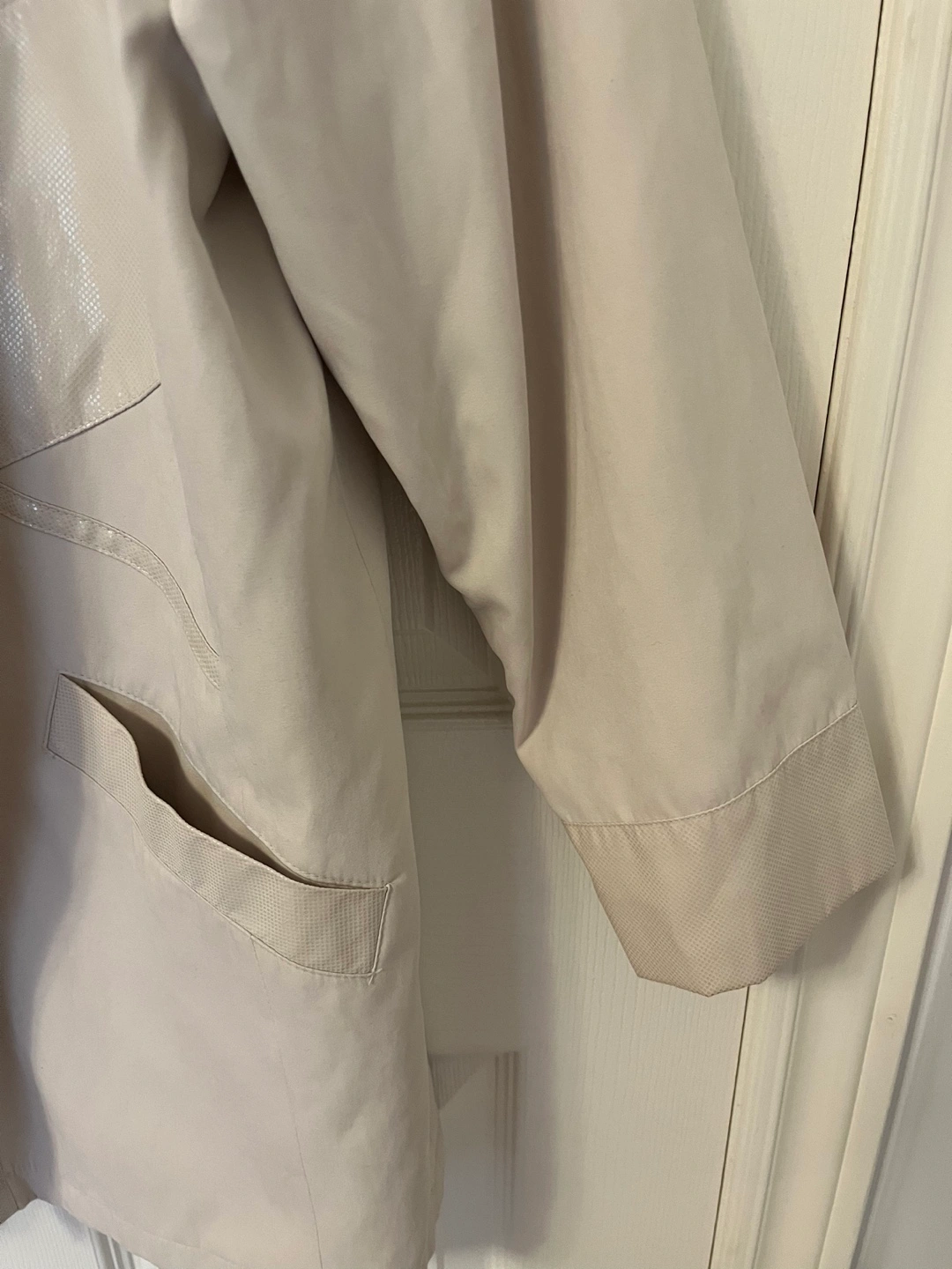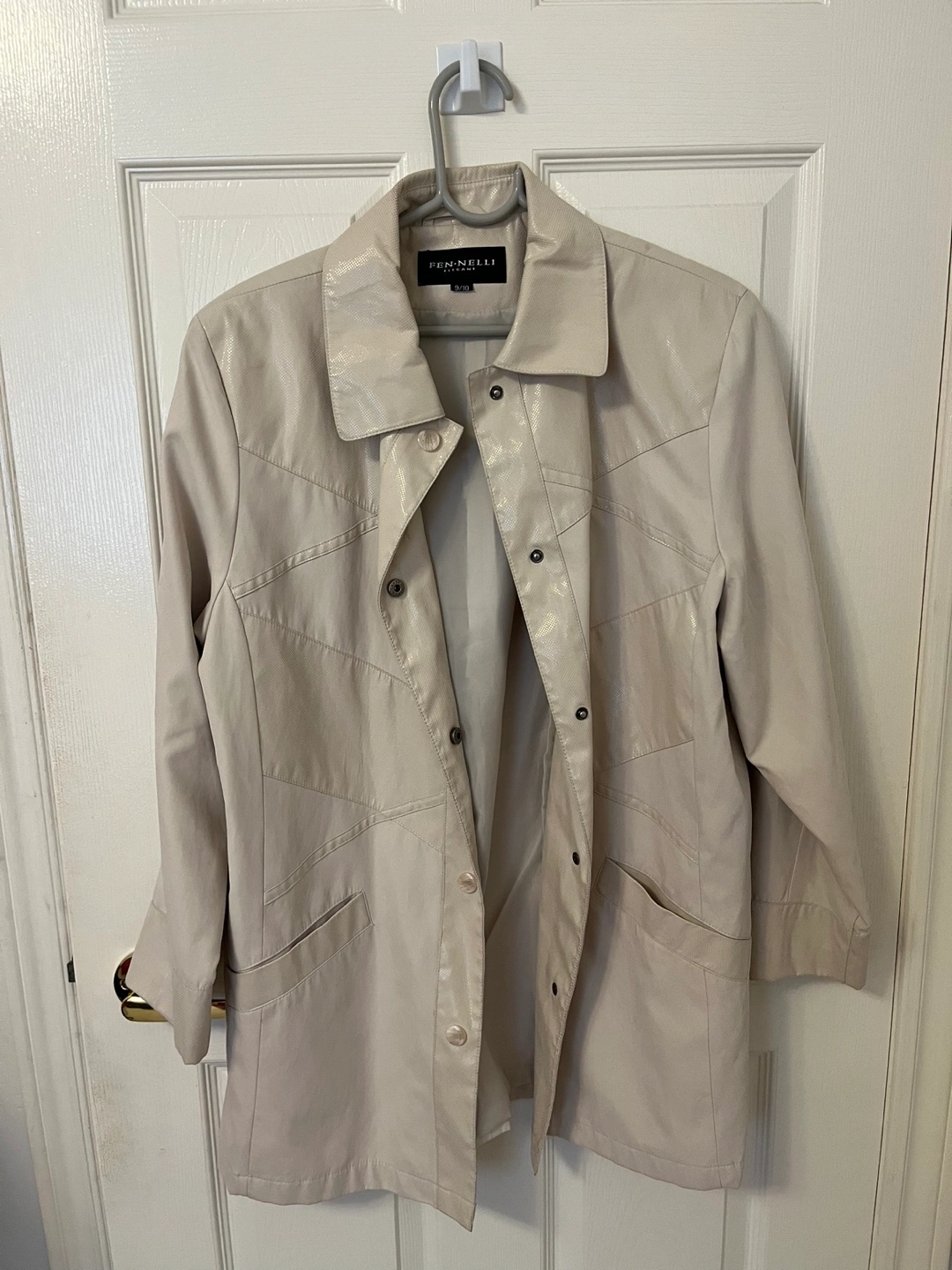 Elegant light beige jacket with a button closure. Features two front pockets and a unique design. The jacket is hardly worn and in good condition.