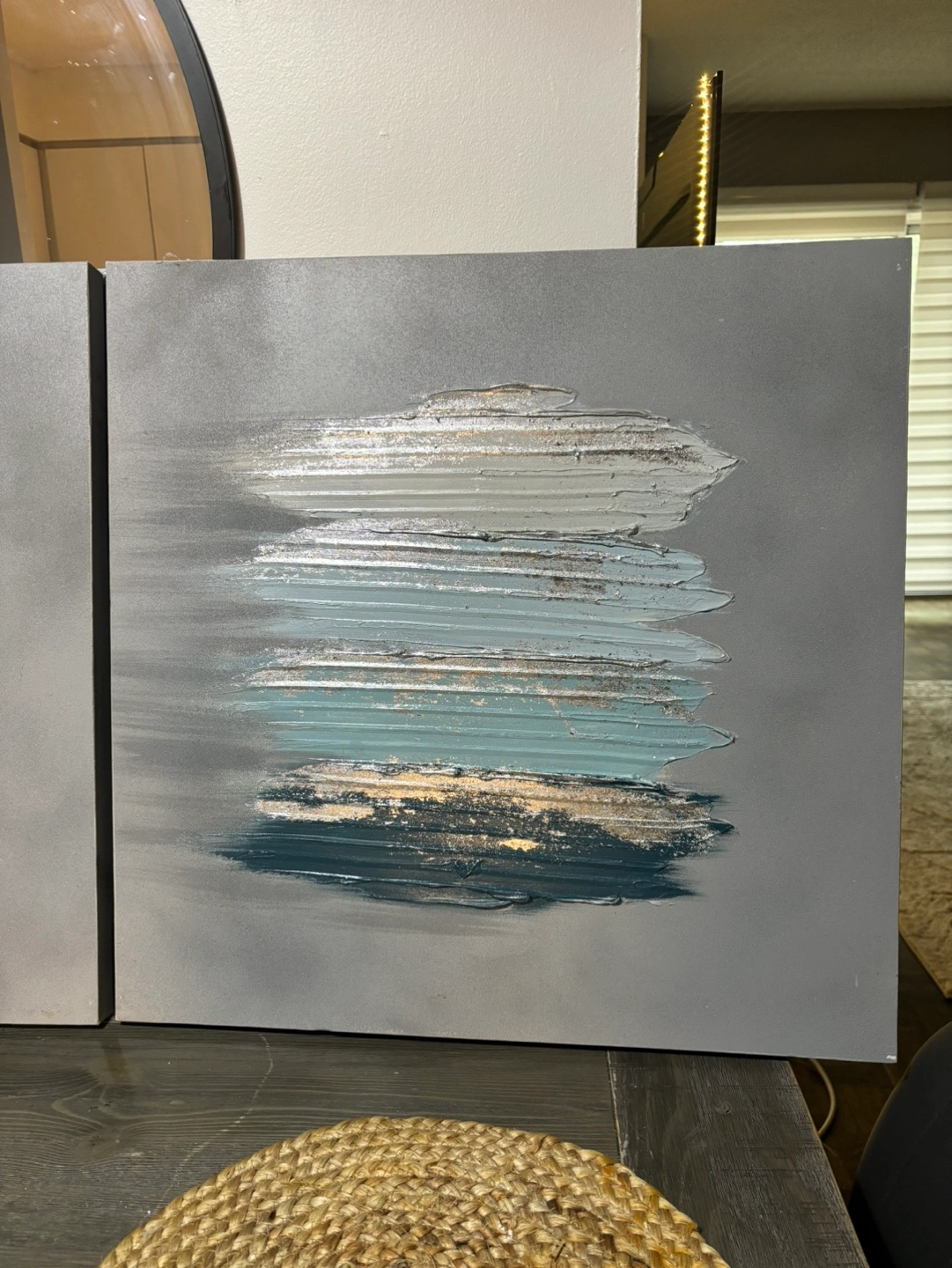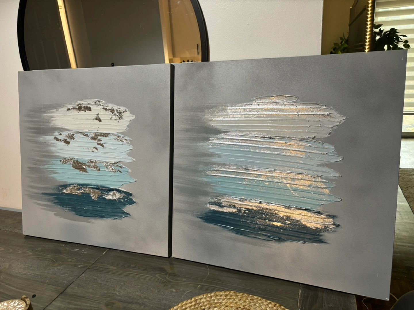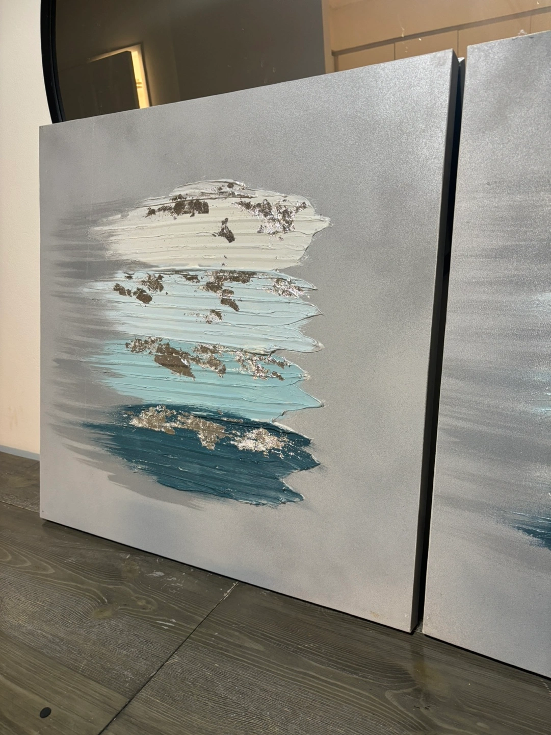 Set of two abstract canvas paintings. Each piece is a square, with a grey background and light blue, white, and silver accents. Great for a modern home decor theme.