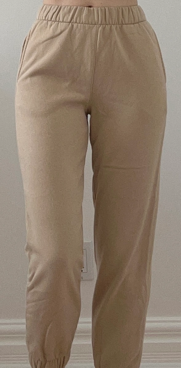 Beige sweatpants with an elastic waistband and pockets. Great for lounging or everyday wear.