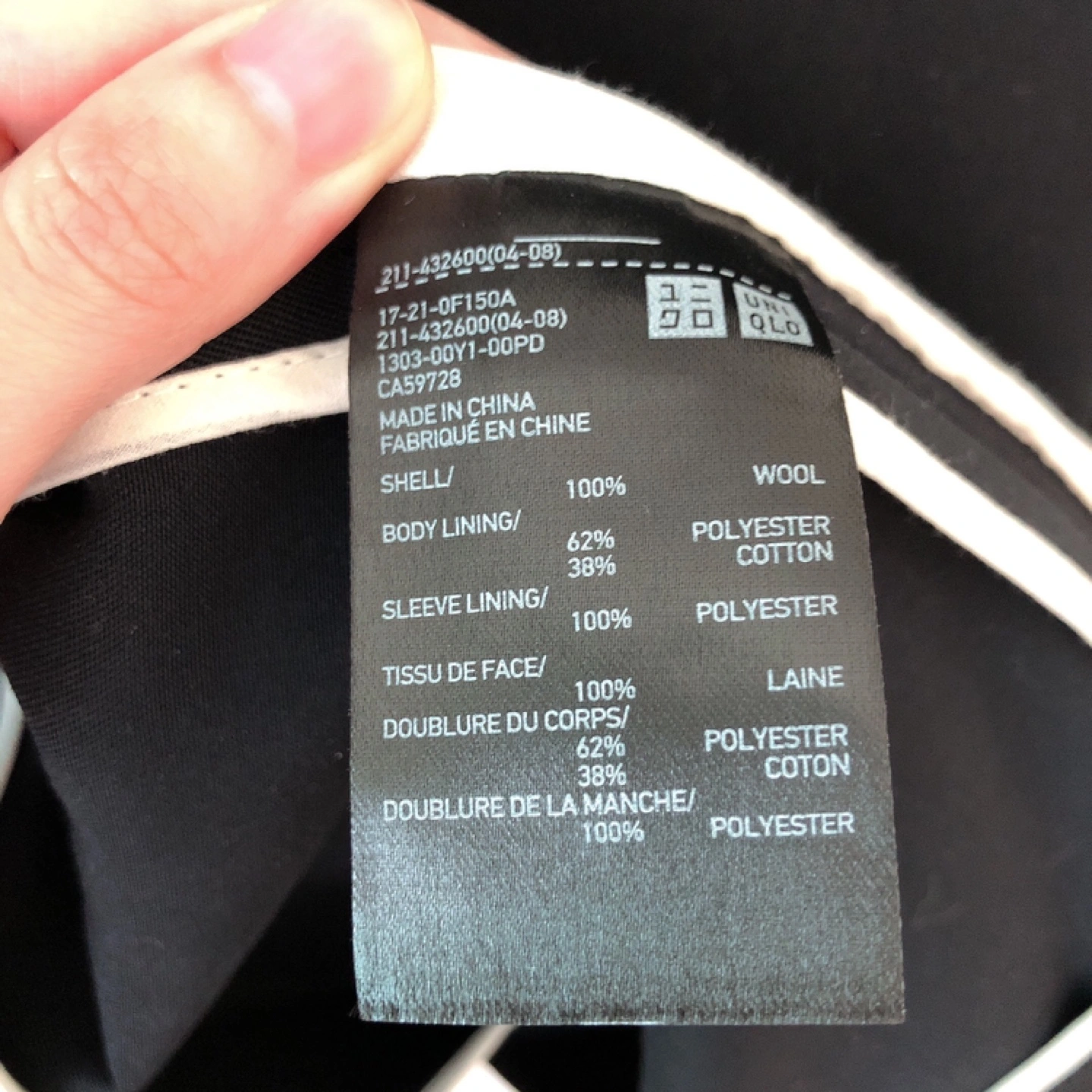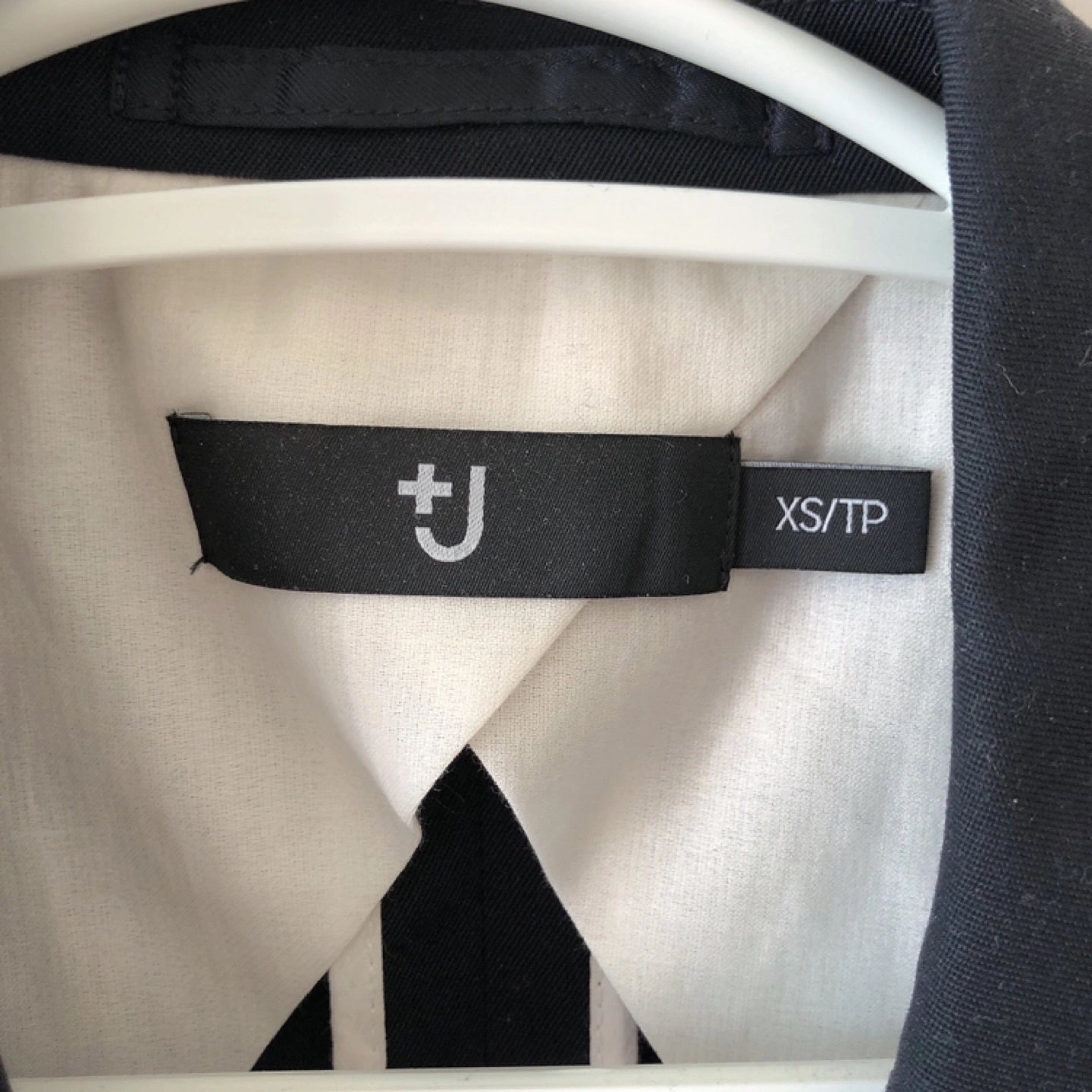 Black blazer with white striped lining. Size XS/TP. 100% wool.