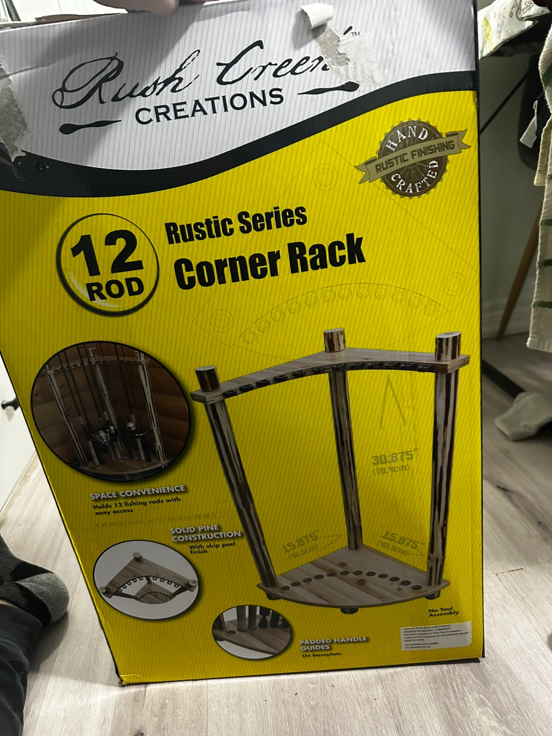 Corner rod rack, holds 12 rods. Made of solid pine with skip peel finish. Protective coating, water resistant, scratch resistant, chip resistant, corrosion resistant. No tool assembly.