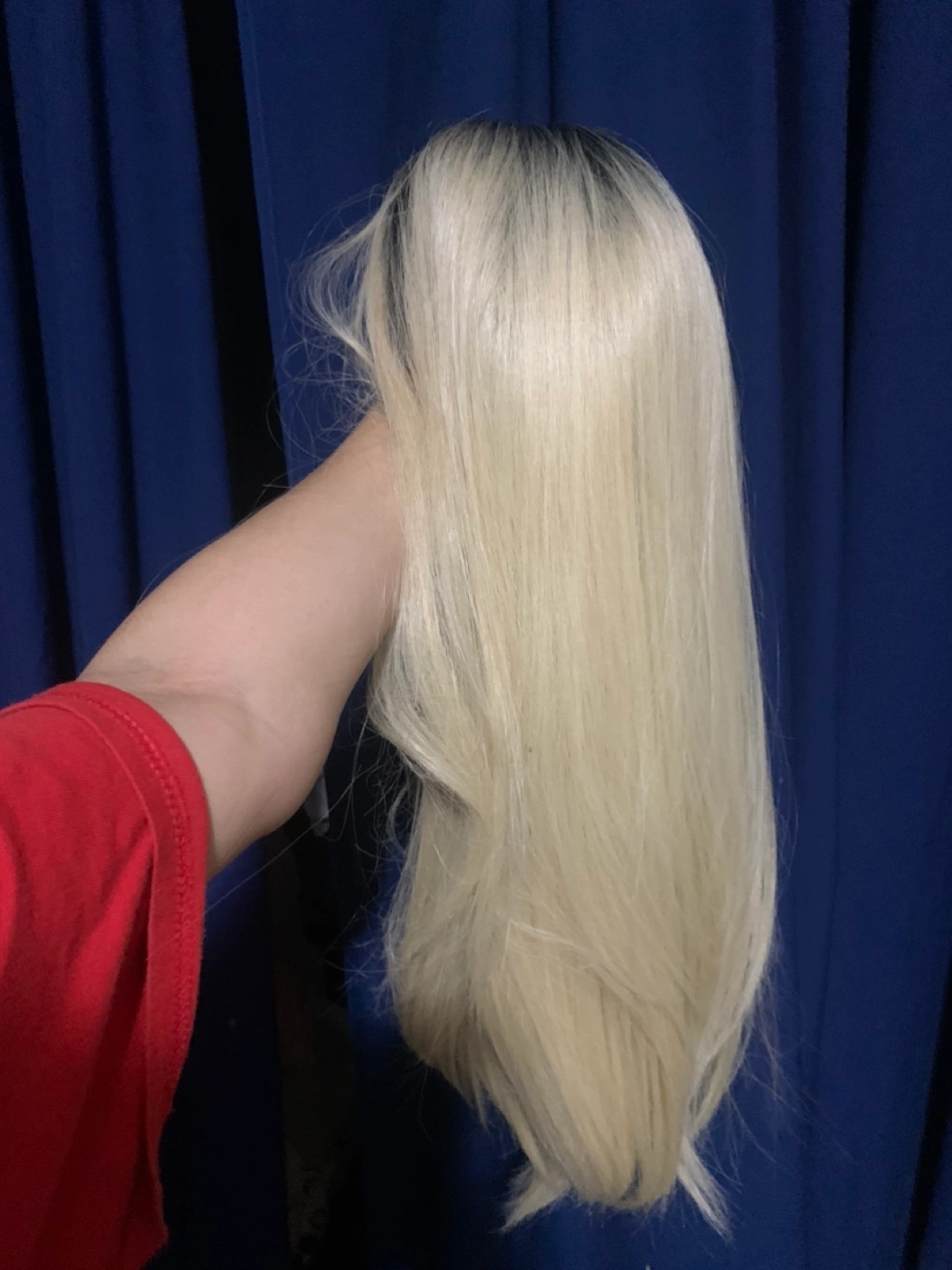 Long, straight, blonde ombre wig with black roots. Used a few times. Looks natural and soft hair.
