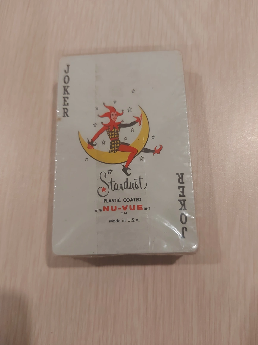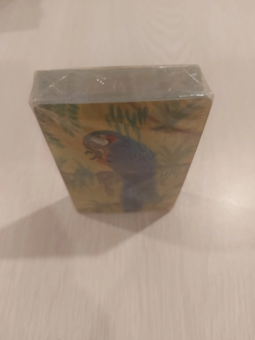Deck of playing cards with a blue parrot design. Plastic coated with Nu-Vue tint. I just found these. Old but unopened. I'm giving away as I have other cards.