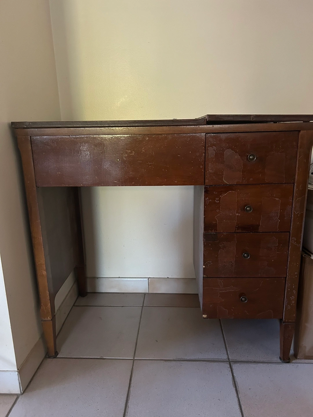 Wooden sewing desk with four drawers. It has some wear and tear, but still functional. Top has two extensions, 66”