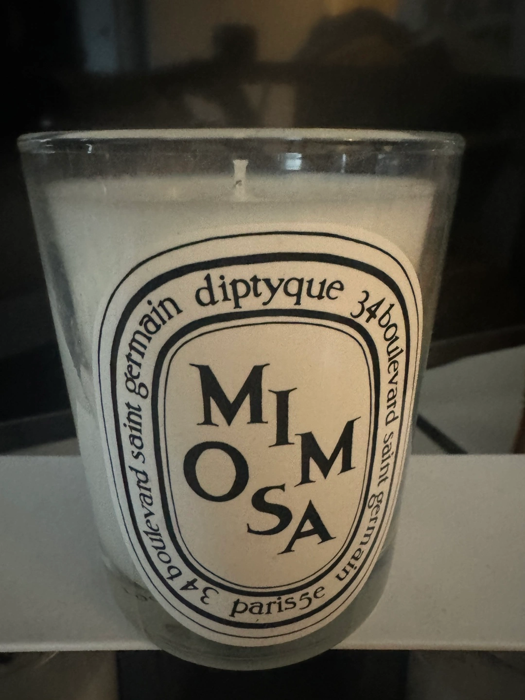 Glass candle with a white wax interior and a black and white label. New and unused. 6.5 oz.