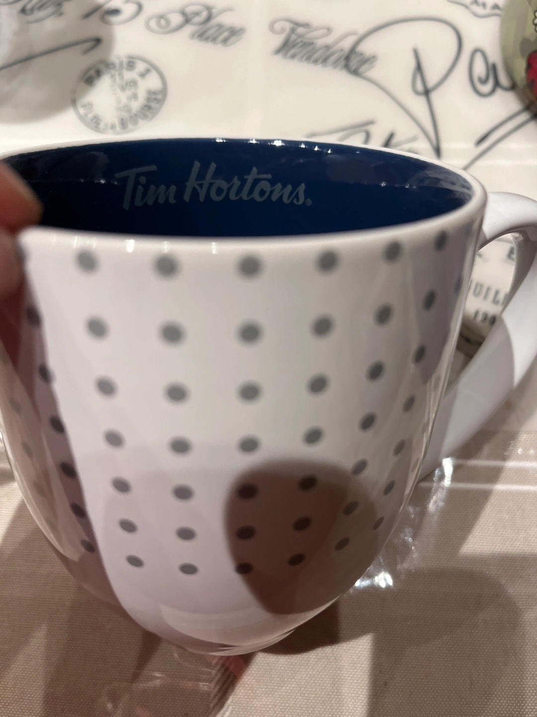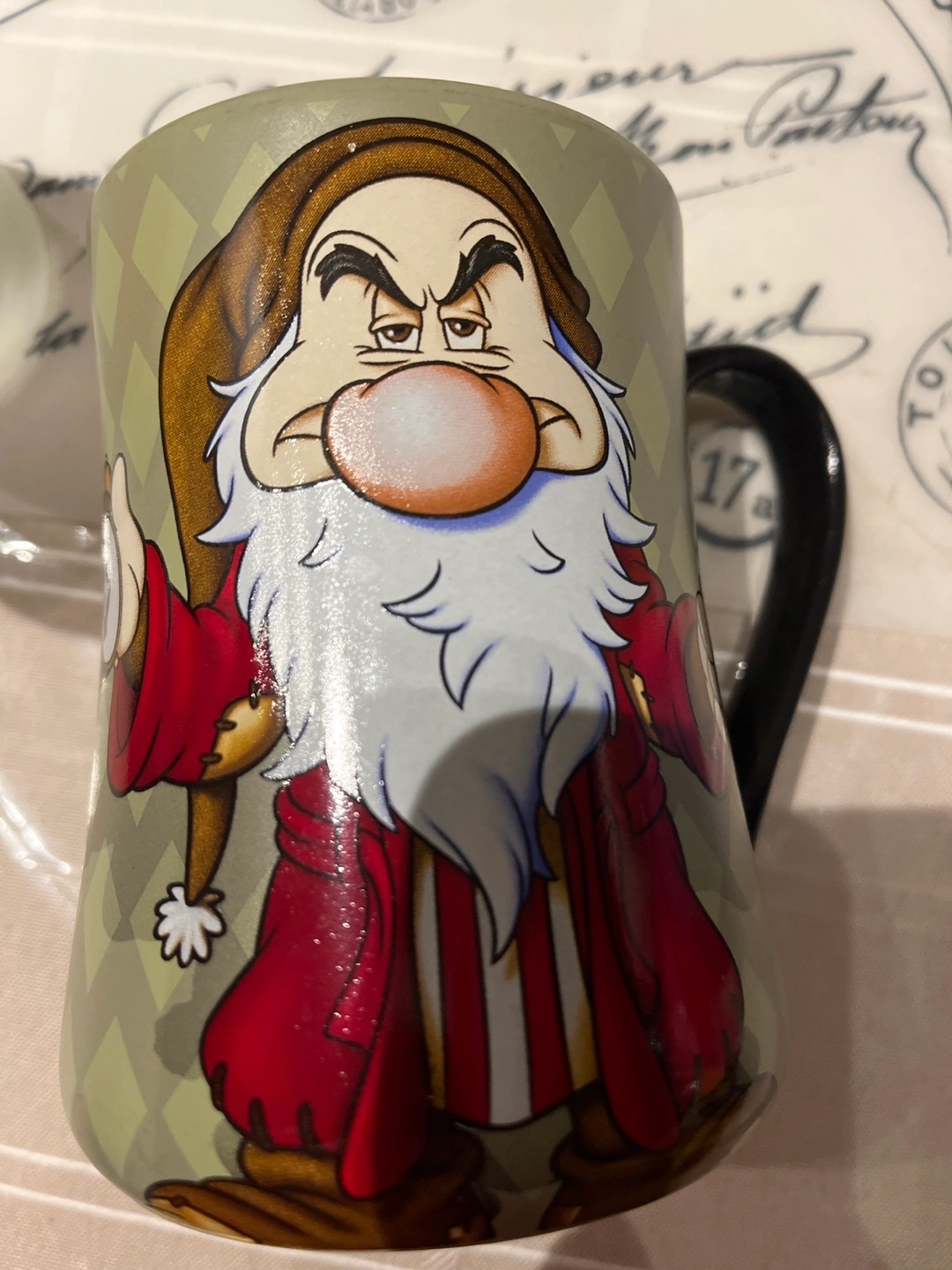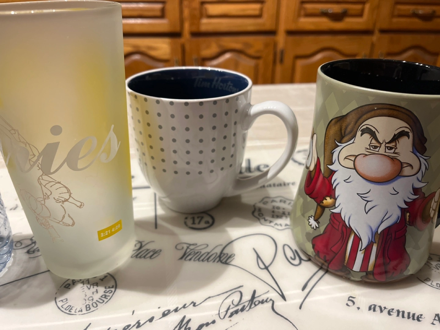 Three mugs. One features Grumpy from Snow White and the Seven Dwarfs. Another is a Tim Hortons mug with a polka dot design. The final one features a zodiac sign. Pick up at Dundas and Bathurst