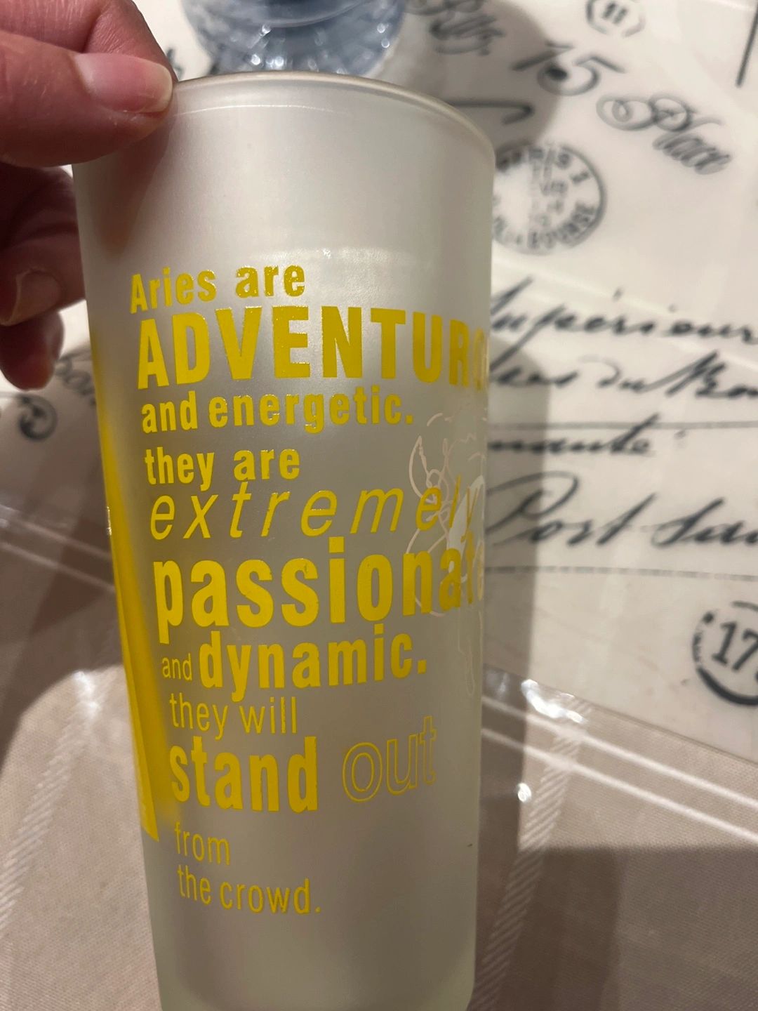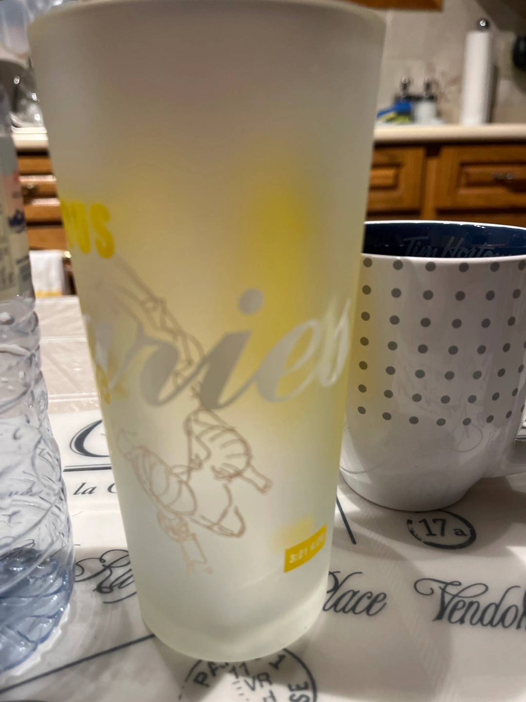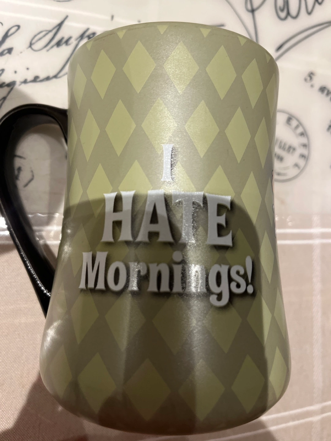 Three mugs. One features Grumpy from Snow White and the Seven Dwarfs. Another is a Tim Hortons mug with a polka dot design. The final one features a zodiac sign. Pick up at Dundas and Bathurst