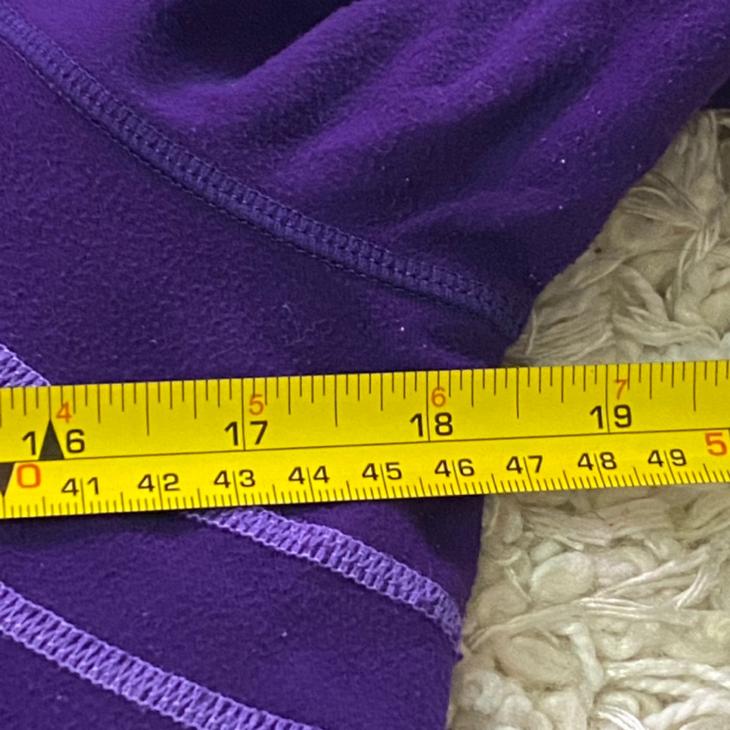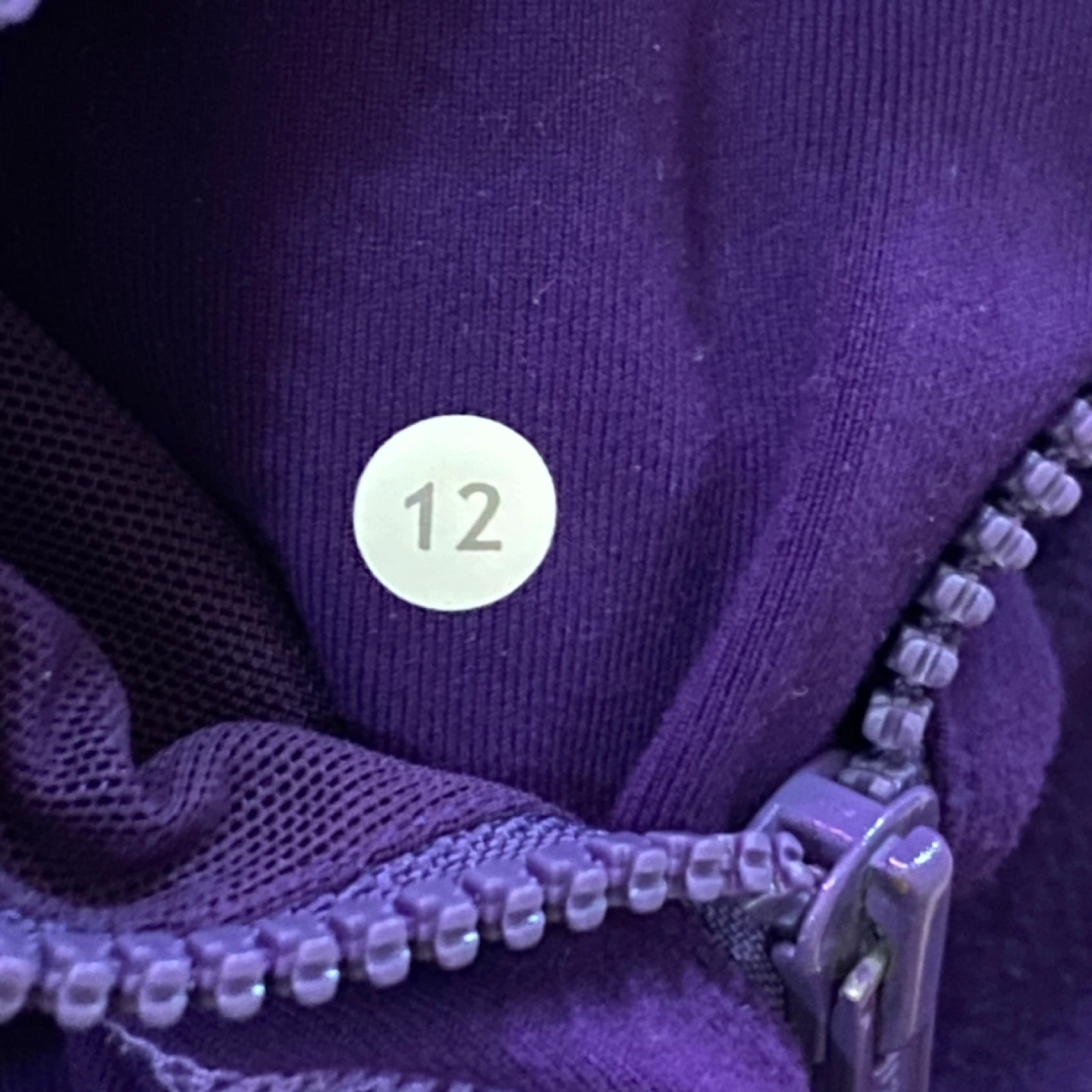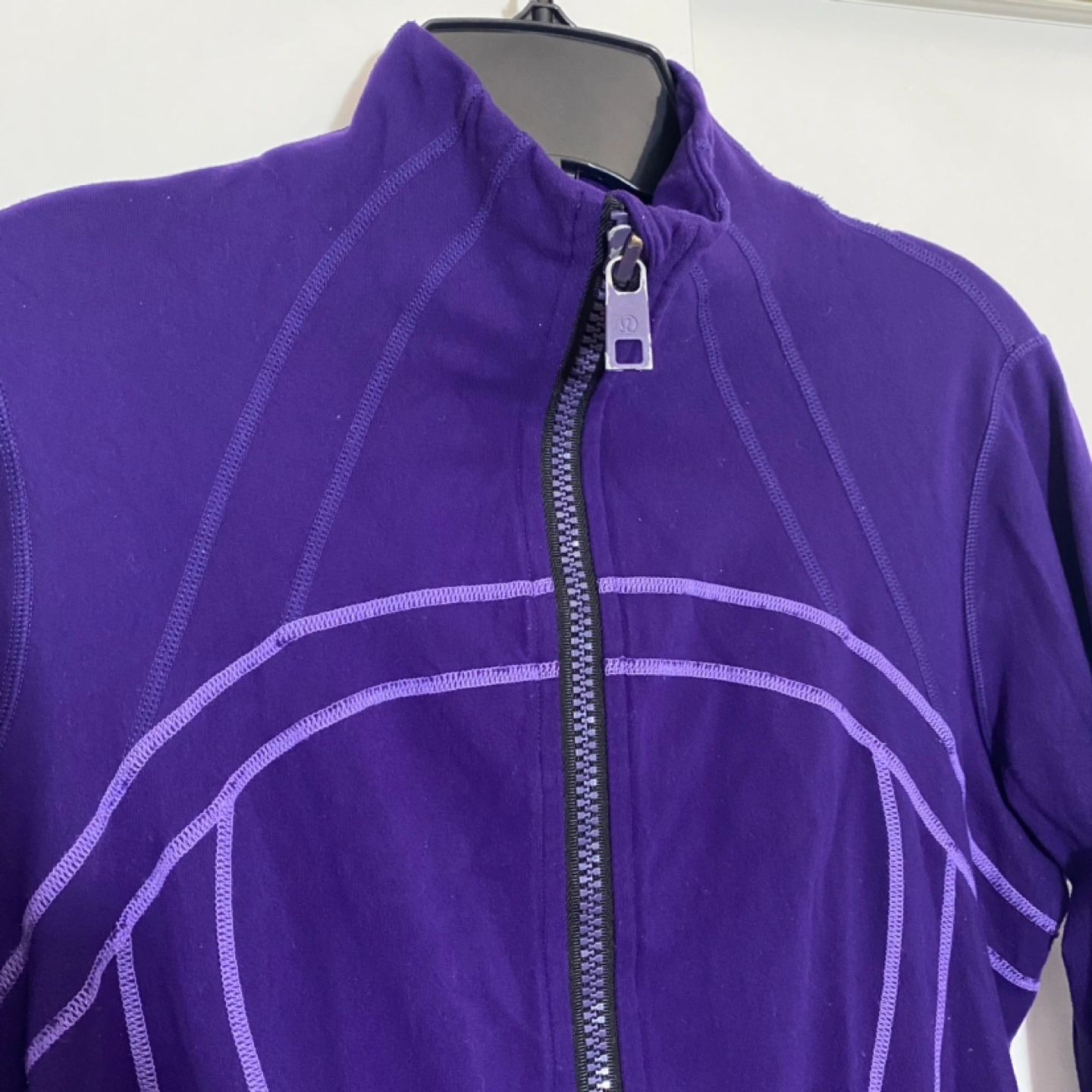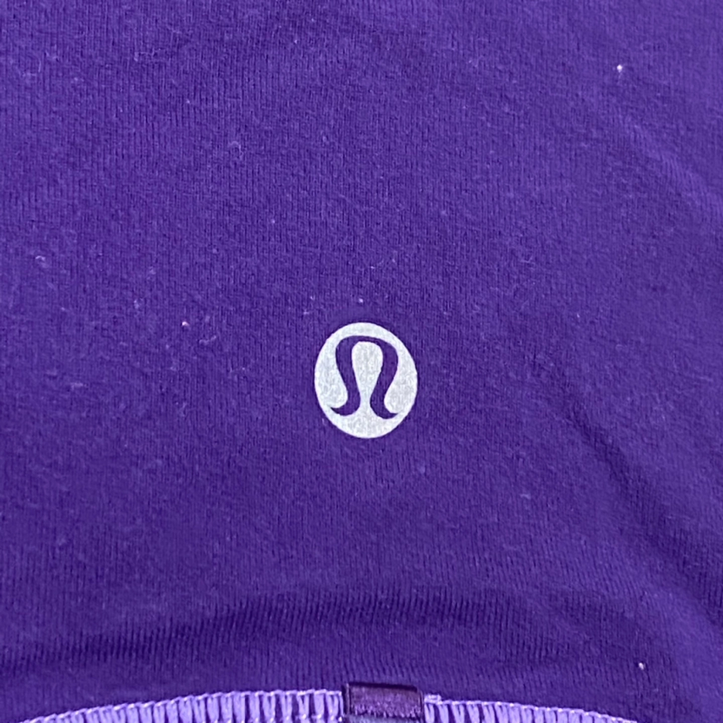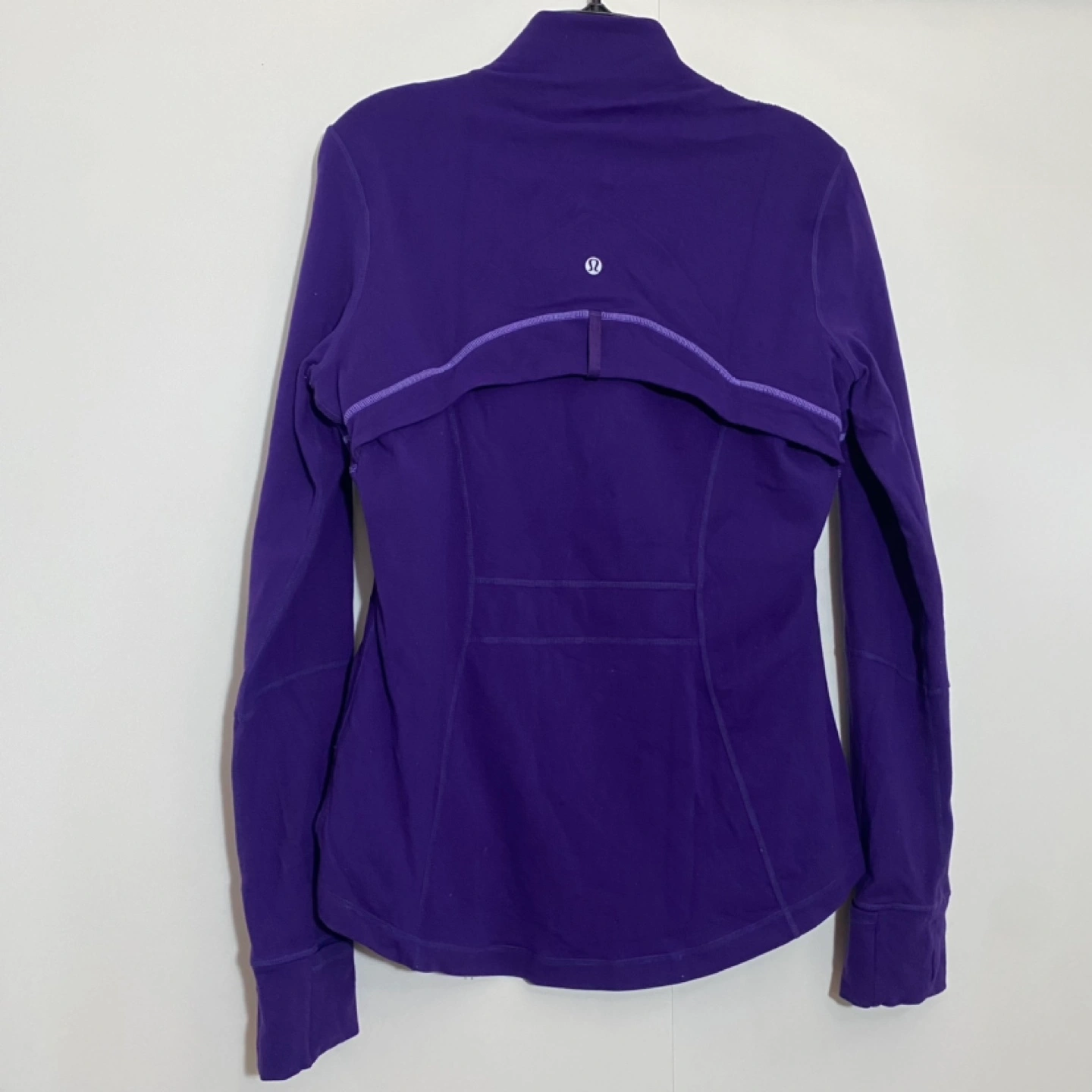 Purple jacket with a full zipper and long sleeves. It has a high collar and a white Lululemon logo on the back.